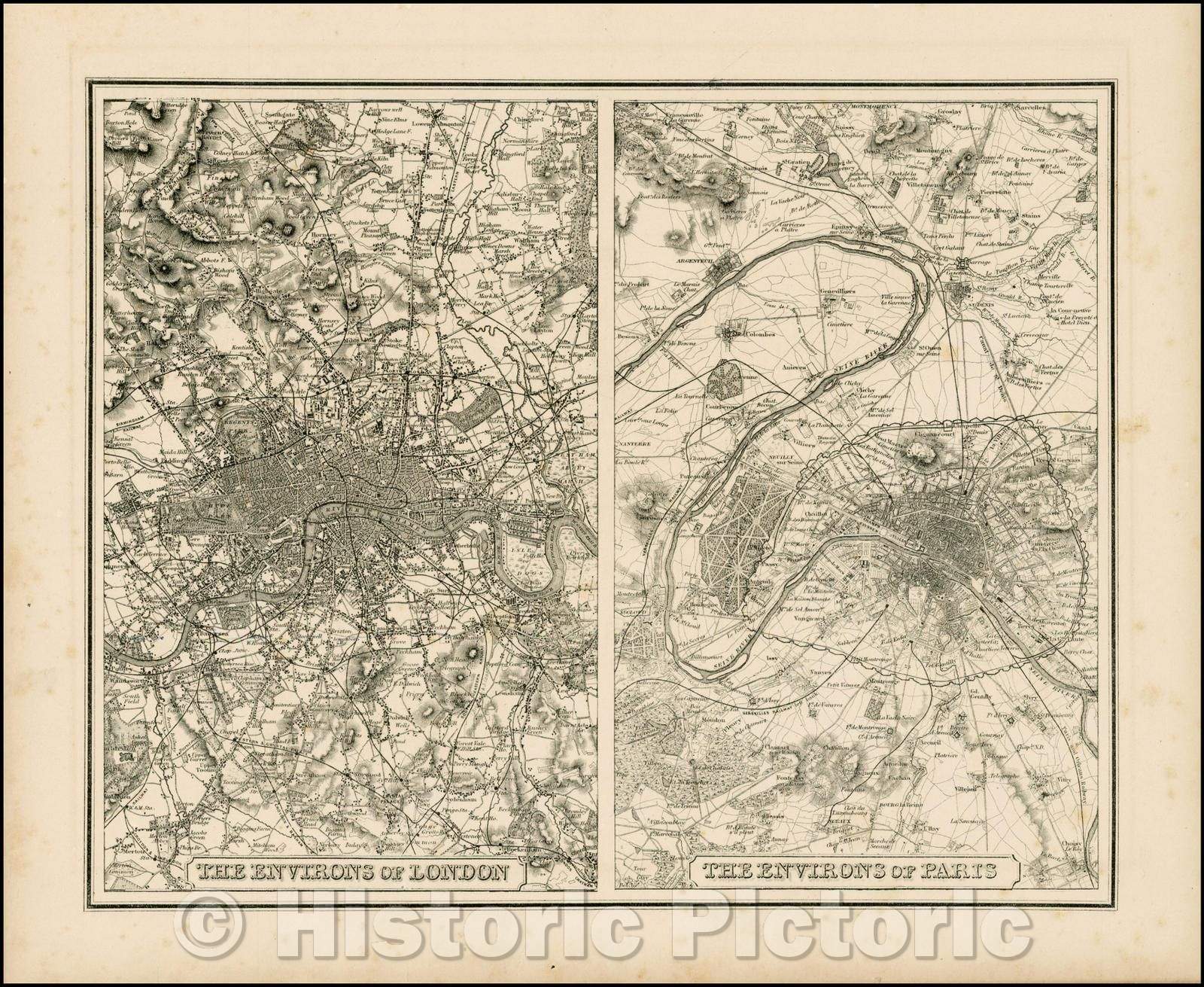 • .Historic Map - The Environs of London [and] The Environs of Paris, 1864, Joseph Hutchins Colton - Vintage Wall Art