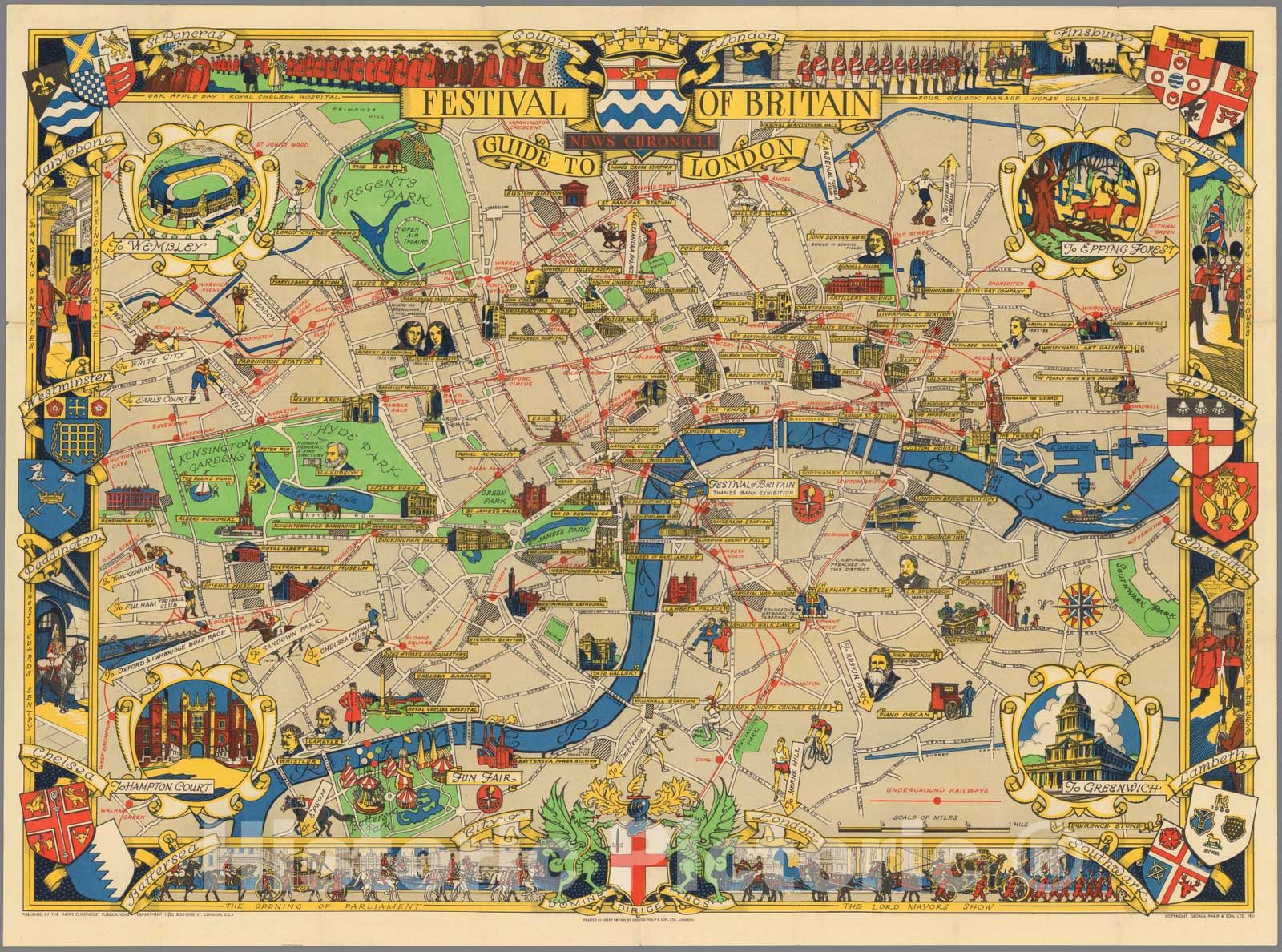 Historic Map : Festival of Britain : Guide to London. News Chronicle 1951 - Vintage Wall Art