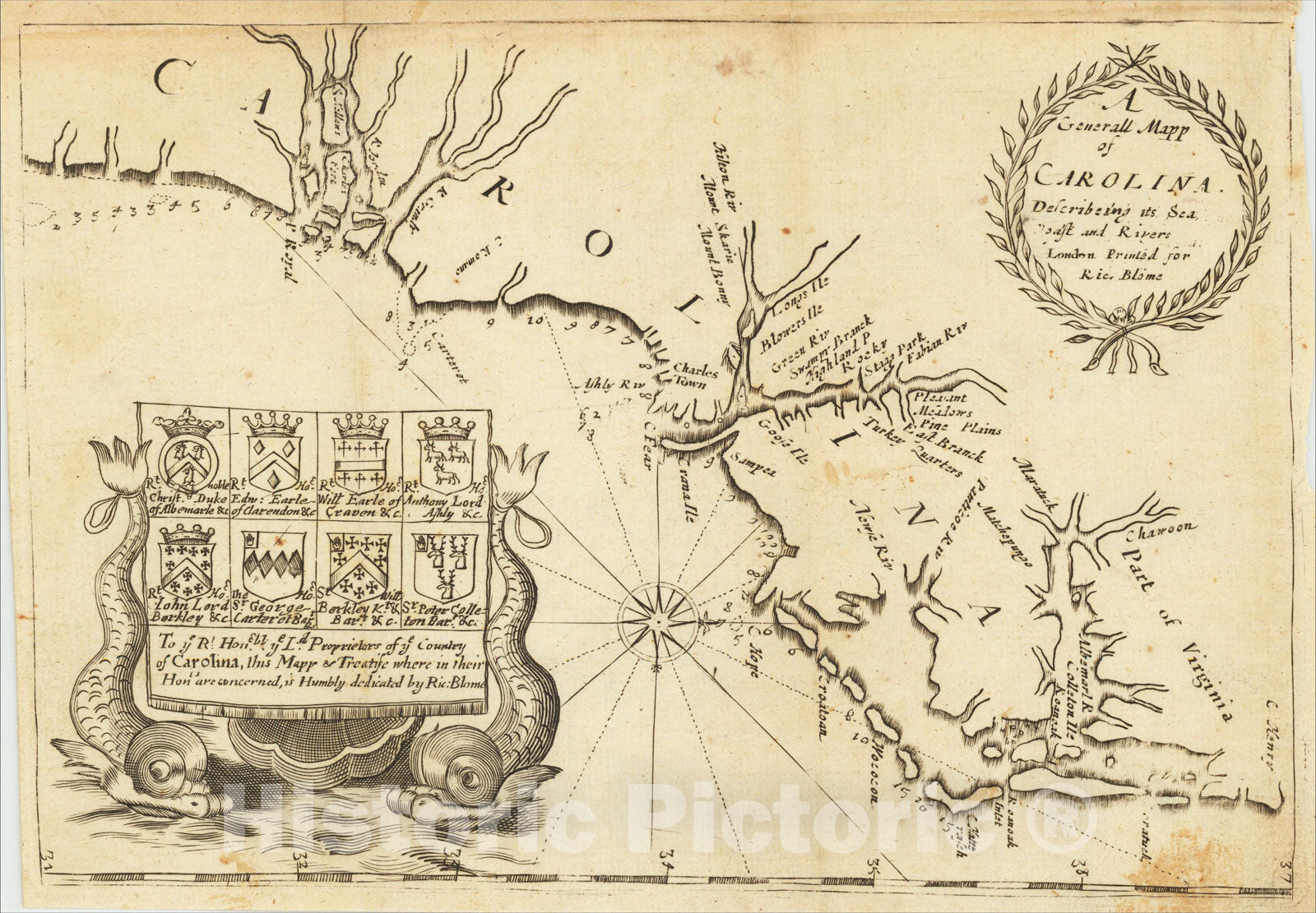 Historic Map : A General Mapp of Carolina Describeing its Sea Coast and Rivers. London Printed for Ric. Blome, 1672, , Vintage Wall Art