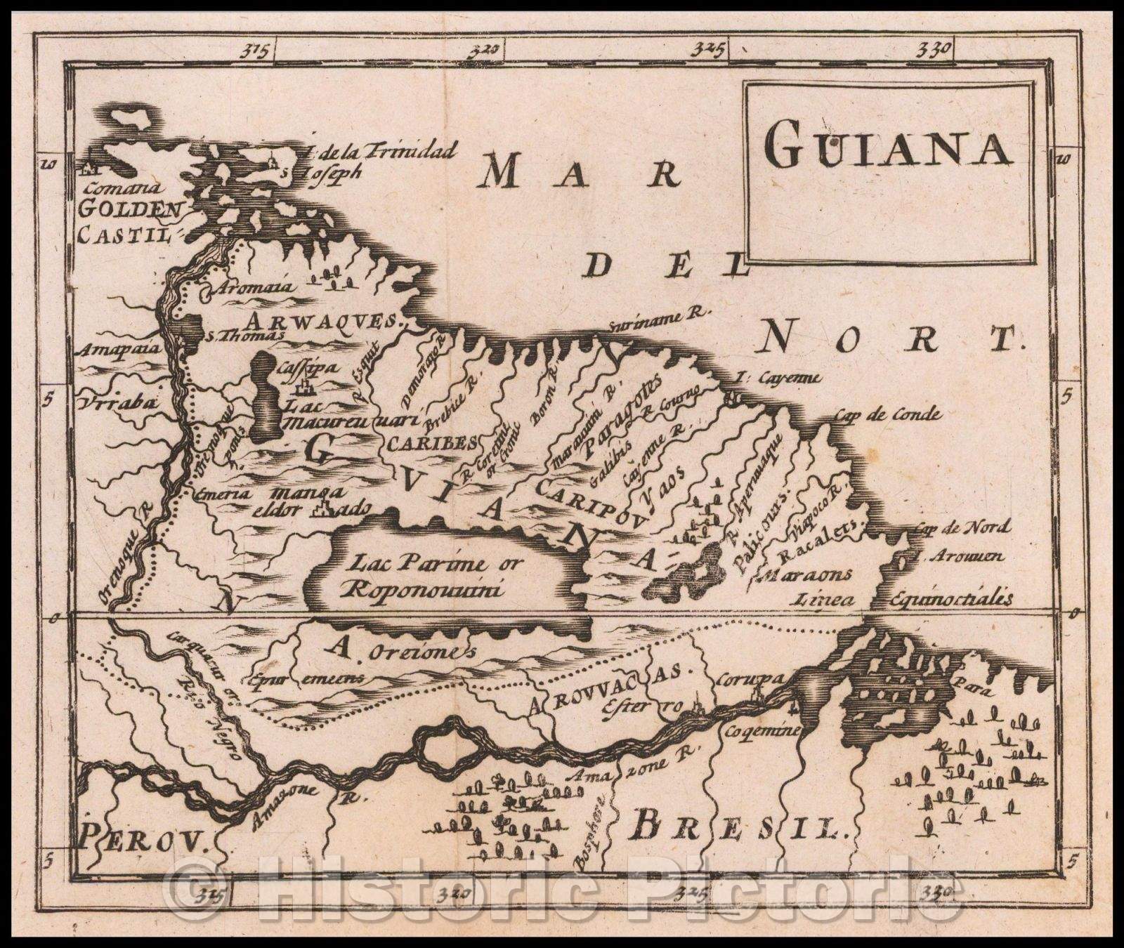 Historic Map - Guiana (El Dorado) / Map of Guiana, Lake Parime Region, with the town of Manor or El Dorado shown, published by Sir Jonas Moore in London, 1681 - Vintage Wall Art