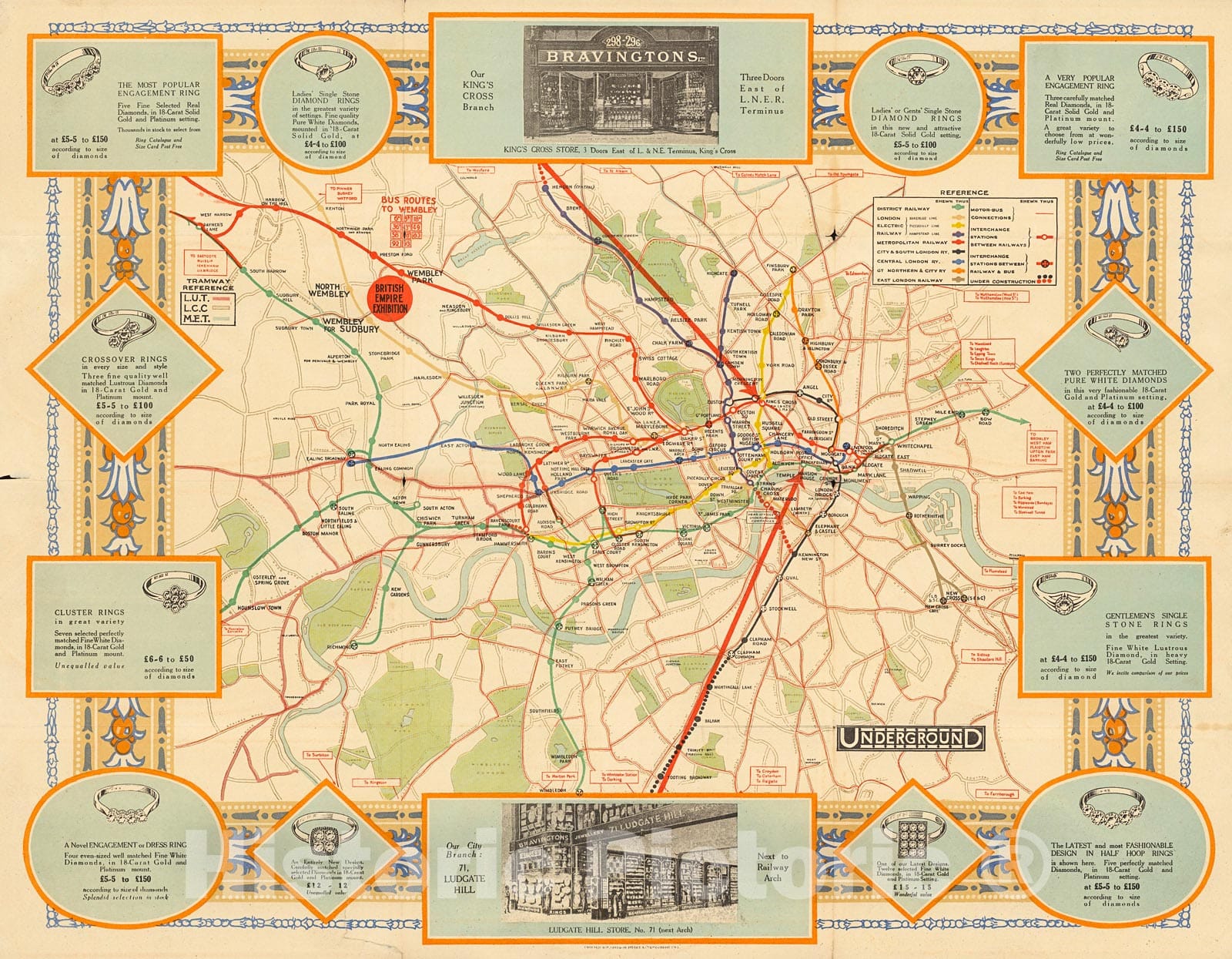 • Historic Map : How to Get to Wembley, Map of the Underground Railways of London with Railway, Bus & Tram Connections., 1922, Vintage Wall Decor