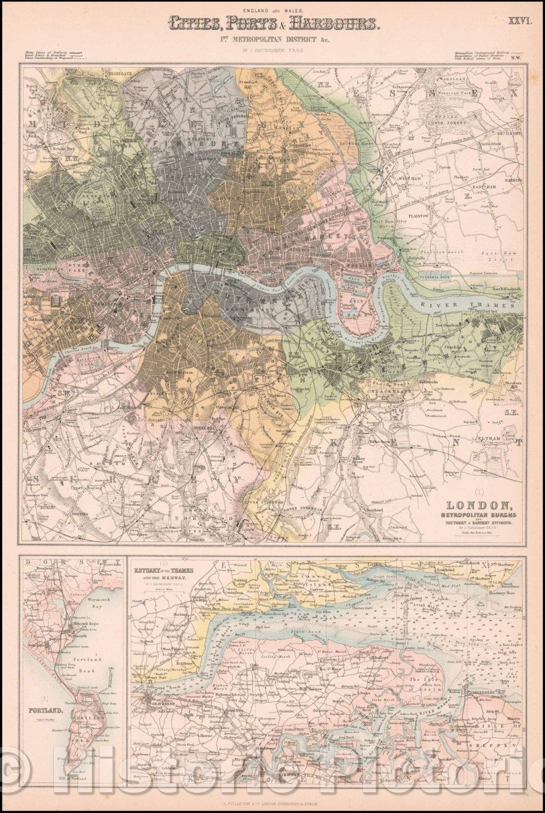 • .Historic Map - London, Metropolitan Burghs and Southern & Eastern Environs (with) Estuary of the Thames and the Medway (and) Portland, 1855 - Vintage Wall Art
