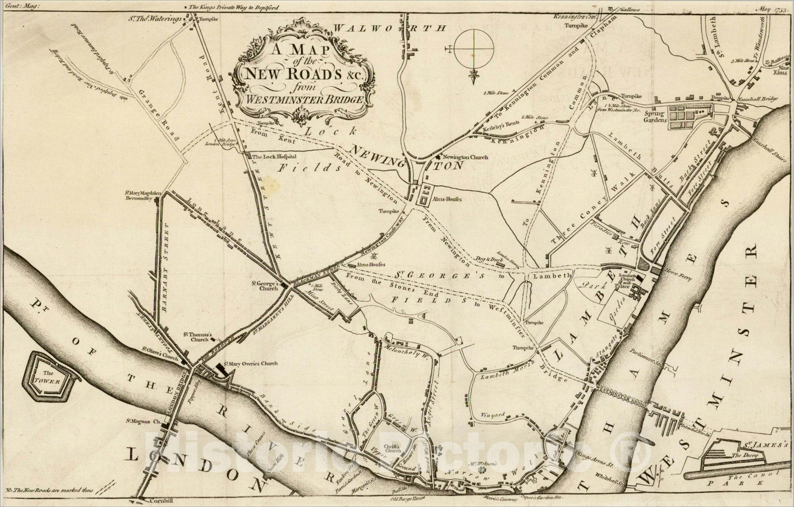 Historic Map : [London] A Map of the New Roads &c. from Westminster Bridge, 1753, Gentleman's Magazine, Vintage Wall Art