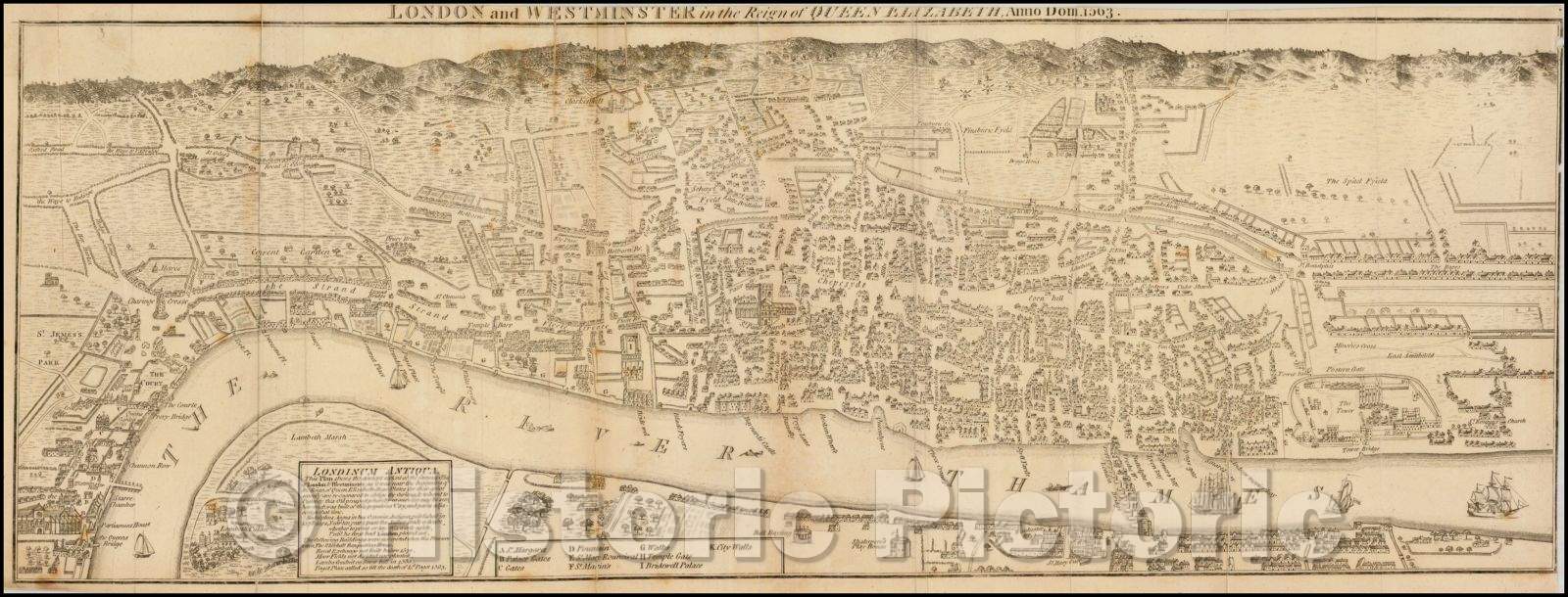 Historic Map - London and Westminster in the Reign of Queen Elizabeth, Anno. Dom. 1563, 1780, S.I. Neele - Vintage Wall Art