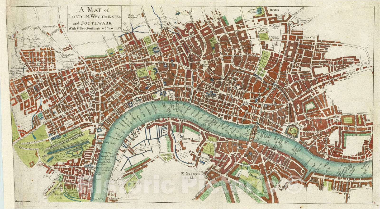 Historic Map : A Map of London, Westminster and Southwark With ye New Buildings to ye Year 1733., 1733, John Mottley, Vintage Wall Art