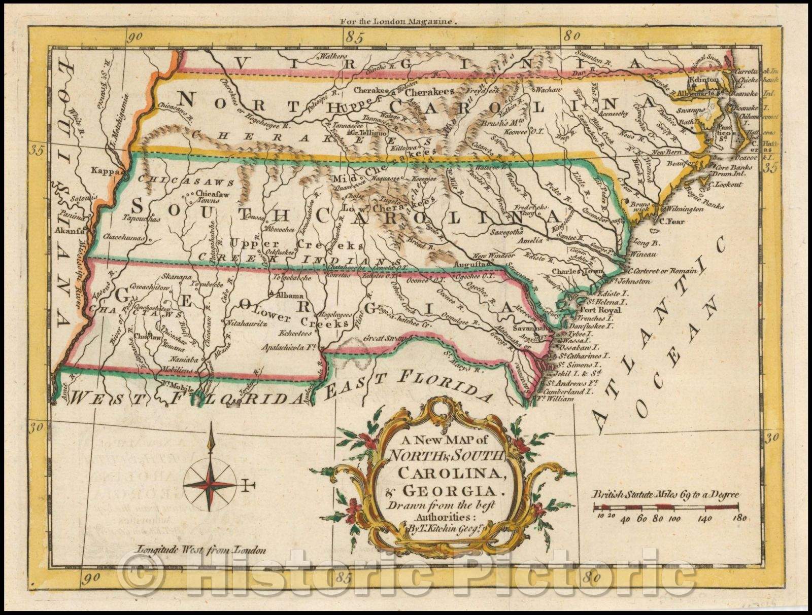 • .Historic Map - North & South Carolina, Georgia, 1765, London Magazine - Vintage Wall Art