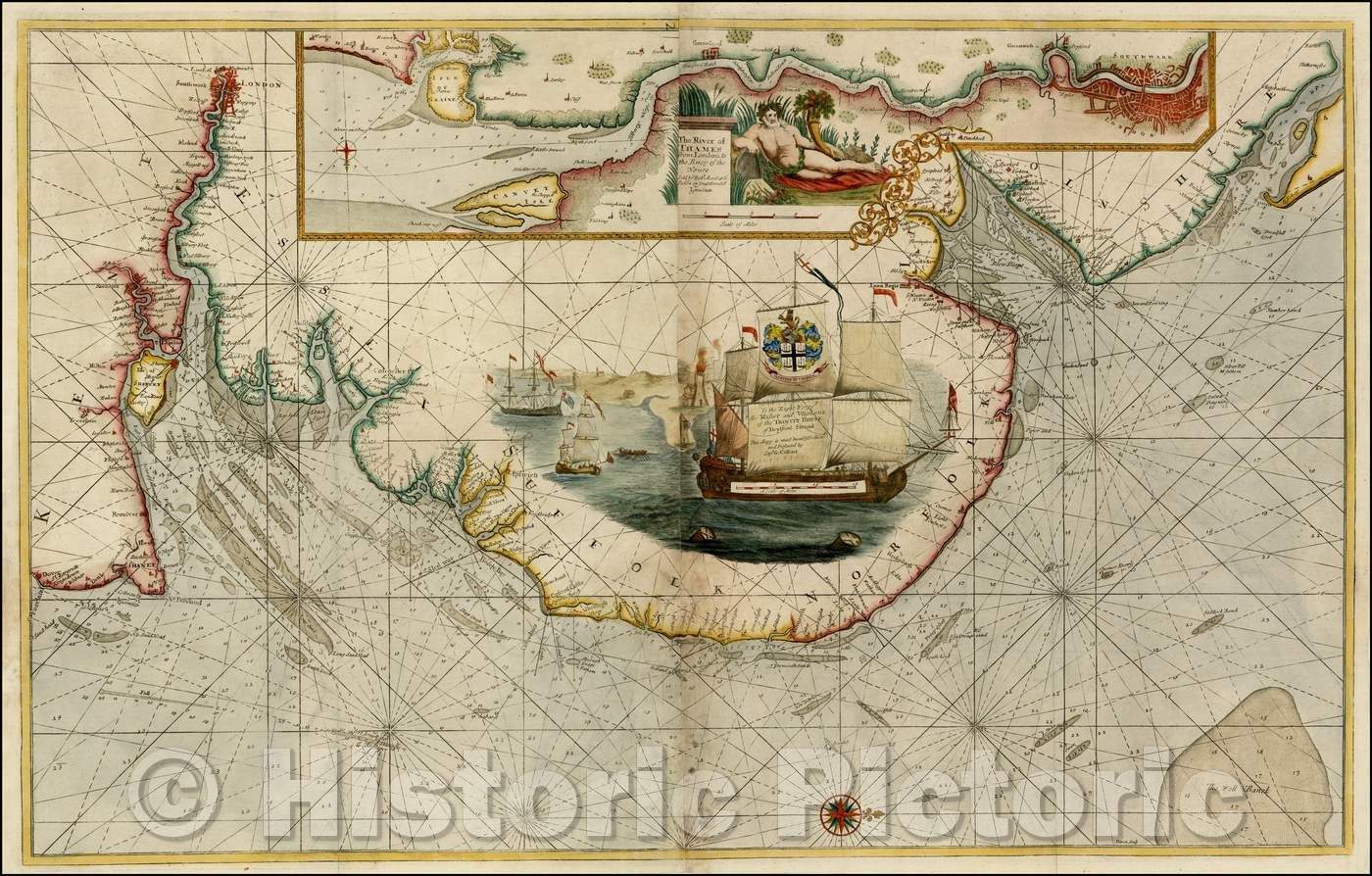 Historic Map - The River of Thames from London to the Buoy of the Noure. Sold, 1693, Mount & Page - Vintage Wall Art