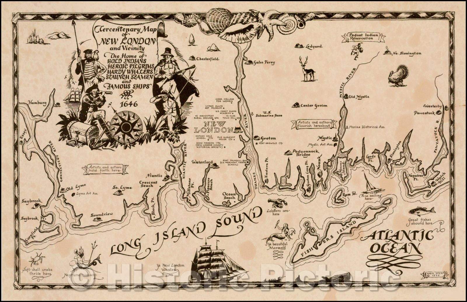 • .Historic Map - Tercentenary Map of New London and Vicinity The Home of Bold Indians Heroic Pilgrims Hardy Whales Staunch Seamen and Famous Ships, 1946 - Vintage Wall Art
