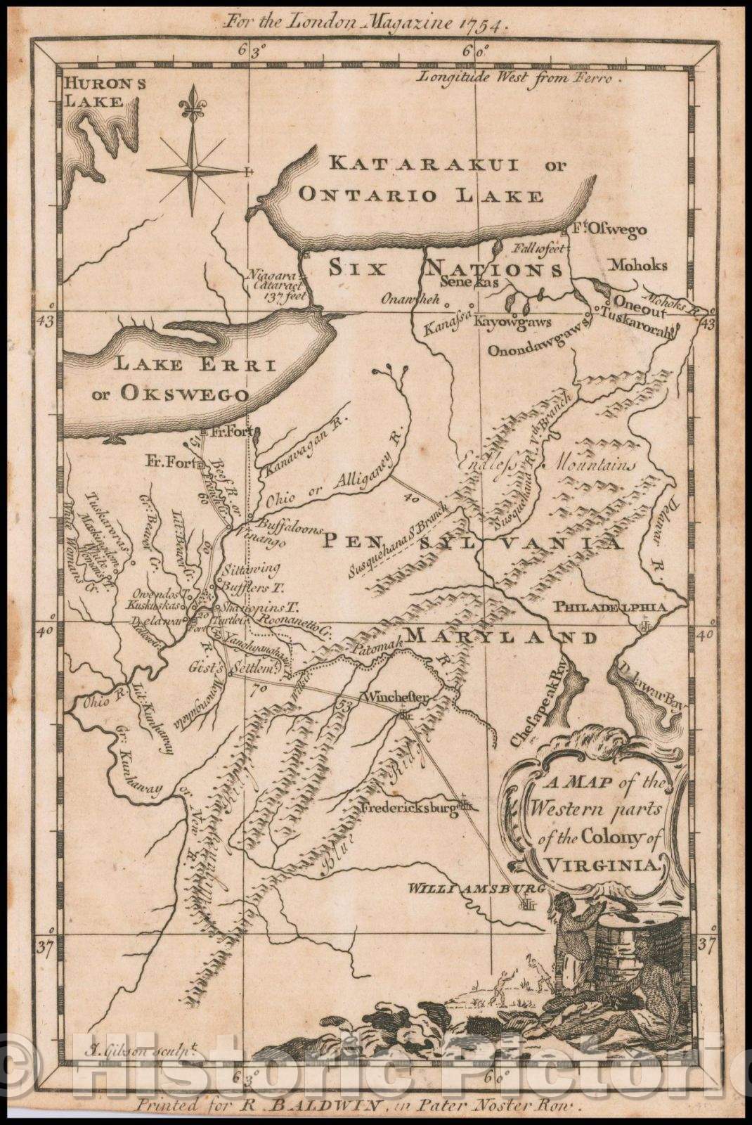 • .Historic Map - Western parts of the Colony of Virginia, 1754, London Magazine - Vintage Wall Art