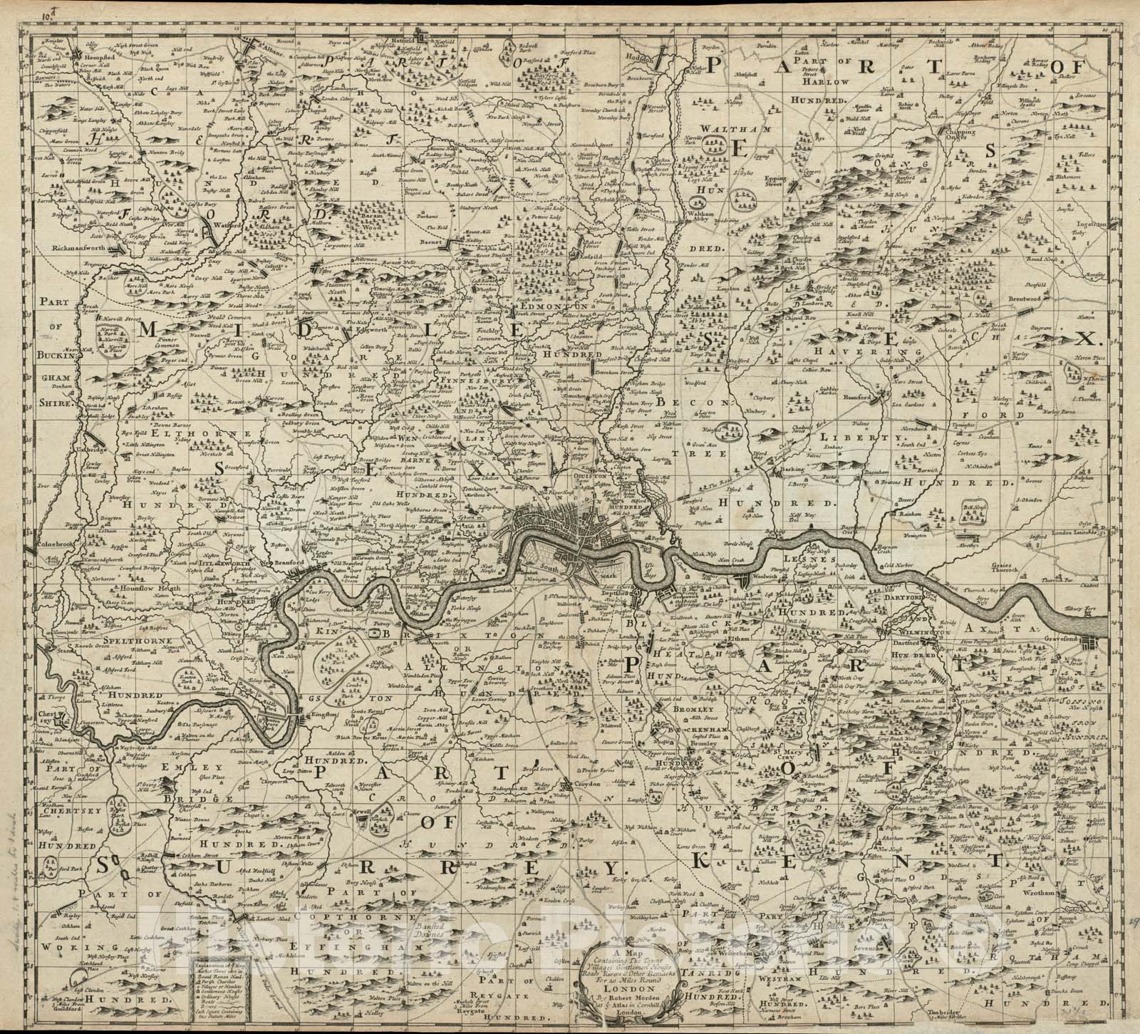 • .Historical Map, 1686 A map containing The Towns, Villages, Gentlemens Houses, Roads, Rivers & Other remarks for 20 Miles Round London, Vintage Wall Art