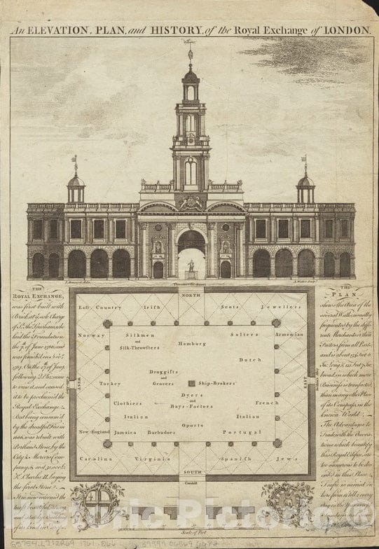 • .Historical Map, 1761 an Elevation, Plan, and History, of The Royal Exchange of London, Vintage Wall Art