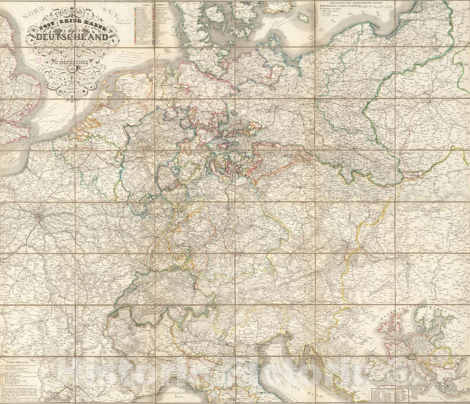 • Historical Map, 1840-1849 Carl JuIˆgel's Post u. Reise karte von Deutschland und den nachbar staaten, bis London, Paris, Montpellier, Florenz, Warschau, Kopenhagen, Vintage Wall Art