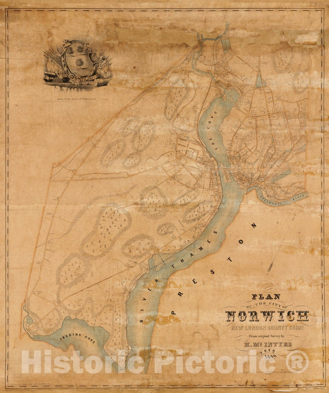 Historical Map, 1850 Plan of The City of Norwich, New London County, Connt, Vintage Wall Art