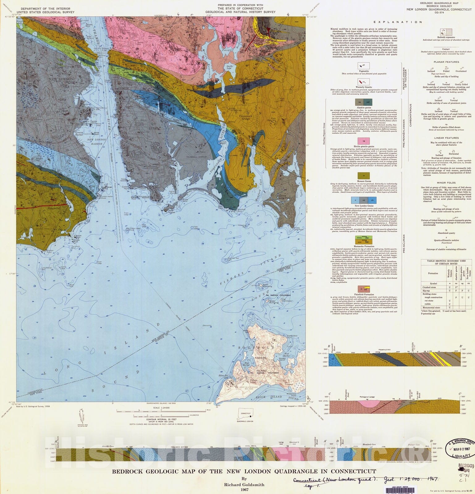 Map : Bedrock geologic map of the New London quadrangle in Connecticut, 1967 Cartography Wall Art :