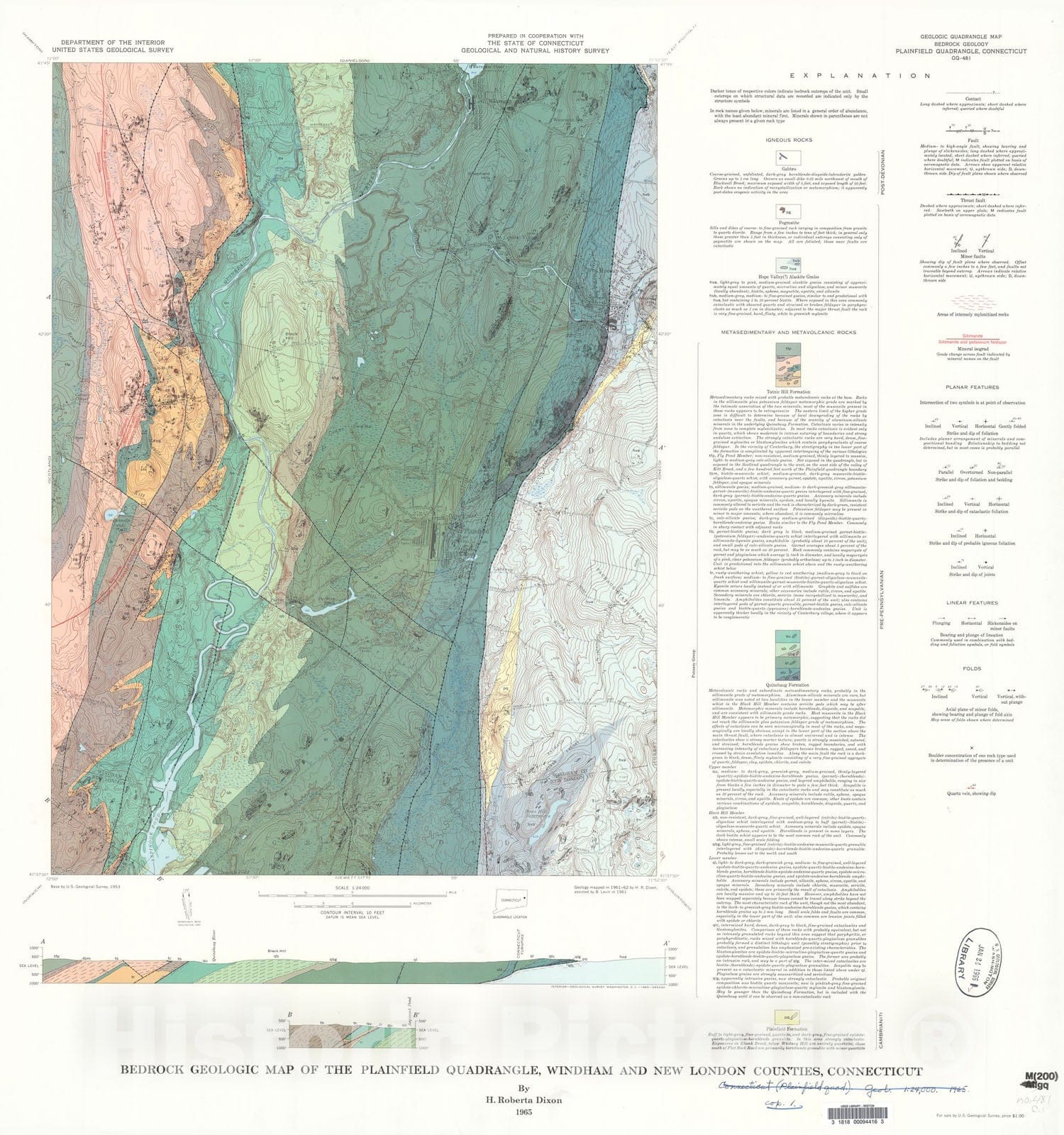 Map : Bedrock geologic map of the Plainfield quadrangle, Windham and New London Counties, Connecticut, 1965 Cartography Wall Art :