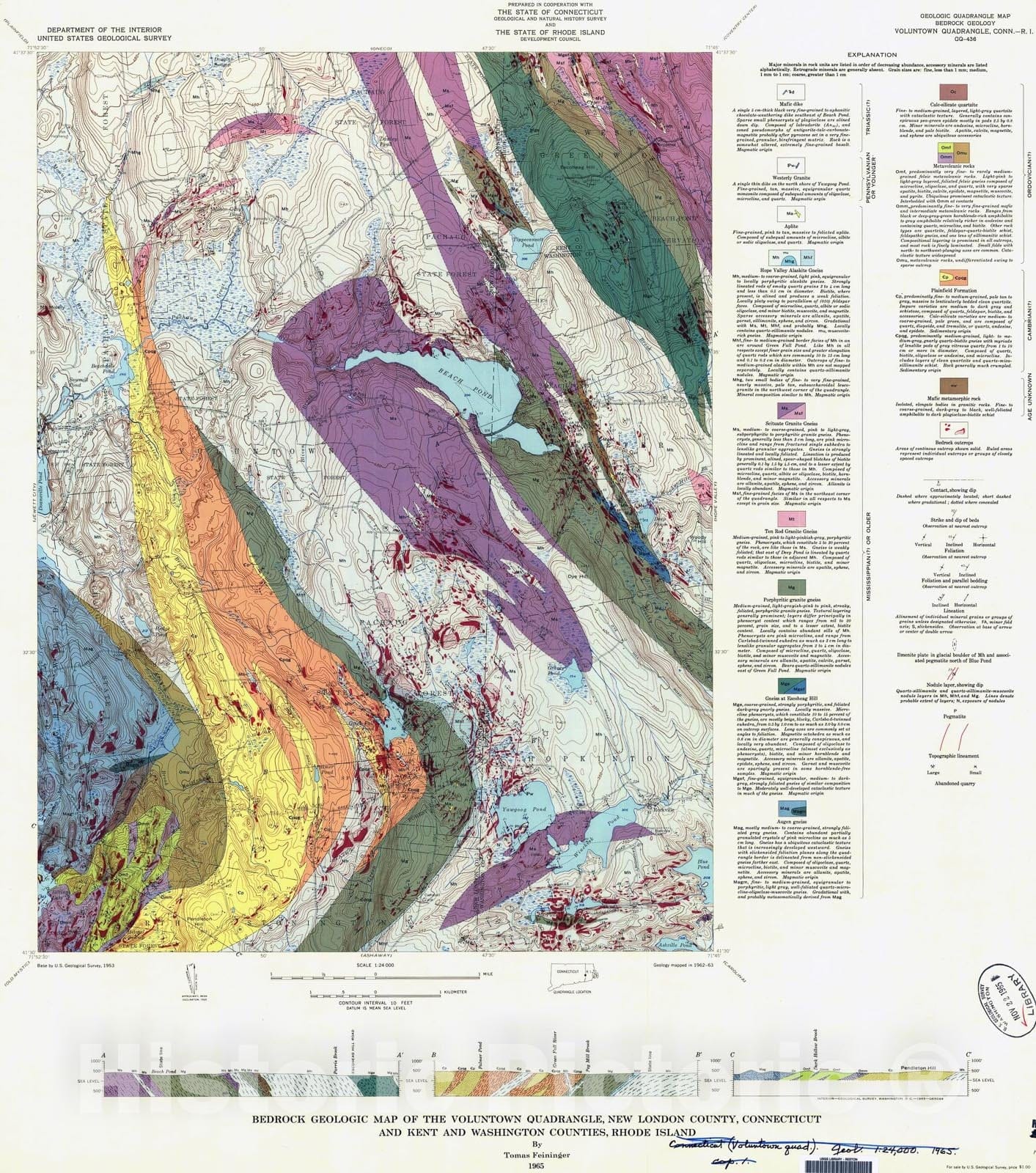 Map : Bedrock geologic map of the Voluntown quadrangle, New London County, Connecticut and Kent and Washington Counties, Rhode Island, 1965 Cartography Wall Art :