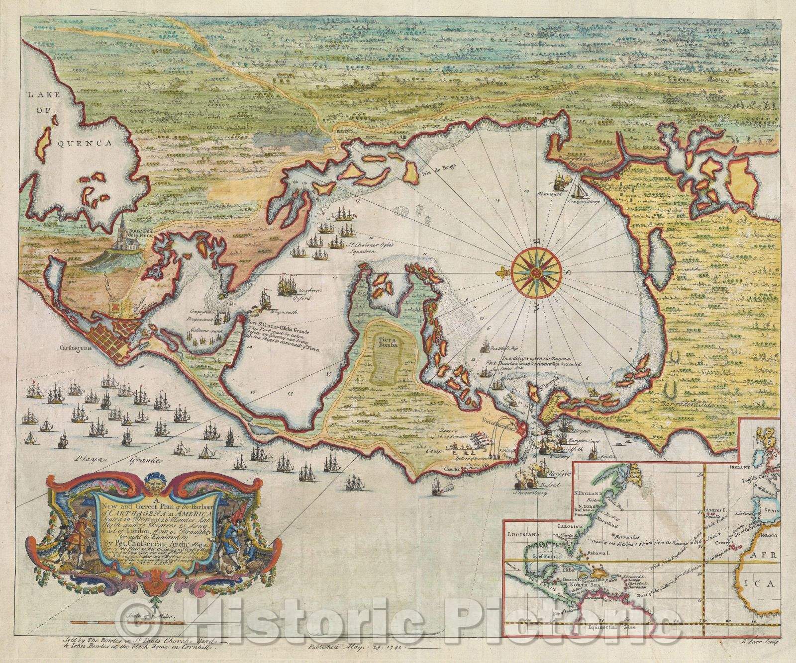 A New and Correct Plan of the Harbour of Carthagena in America Seated 16 Degrees 26 Minutes Lat. north and 75 degrees 21 Long. West of London, 1741