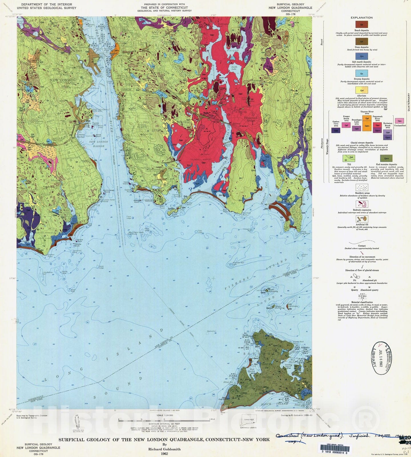 • .Map : Surficial geology of the New London quadrangle, Connecticut-New York, 1962 Cartography Wall Art :
