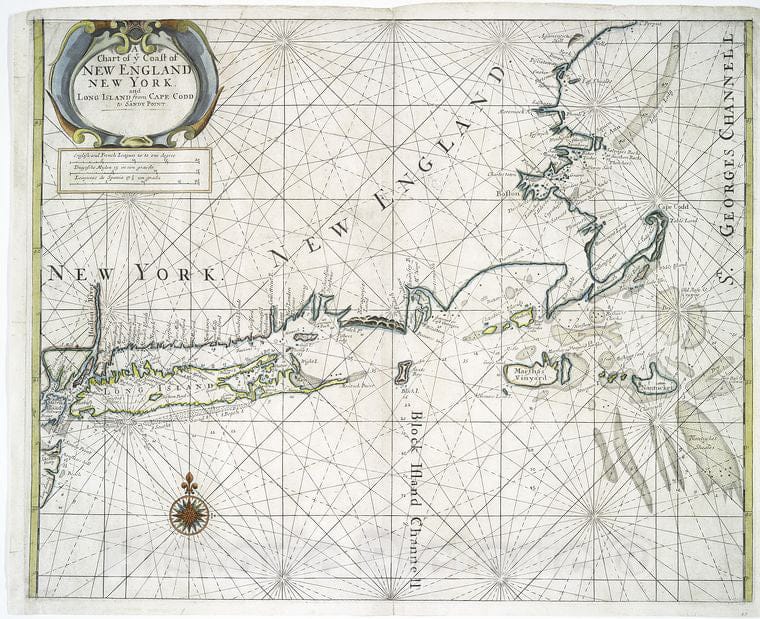 Historic 1706 Map - A Chart Of Ye Coast Of New England, New York And Long Island Fro - Vintage Wall Art