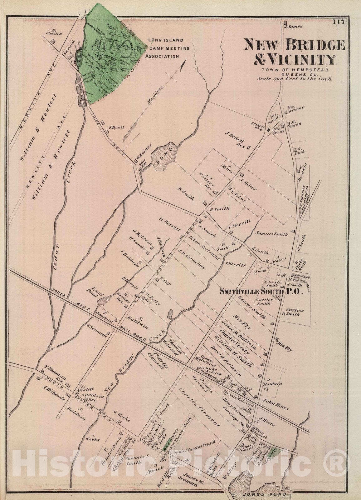 Historic Map : 1873 New Bridge and Vicinity, in Hampstead. Long Island. - Vintage Wall Art