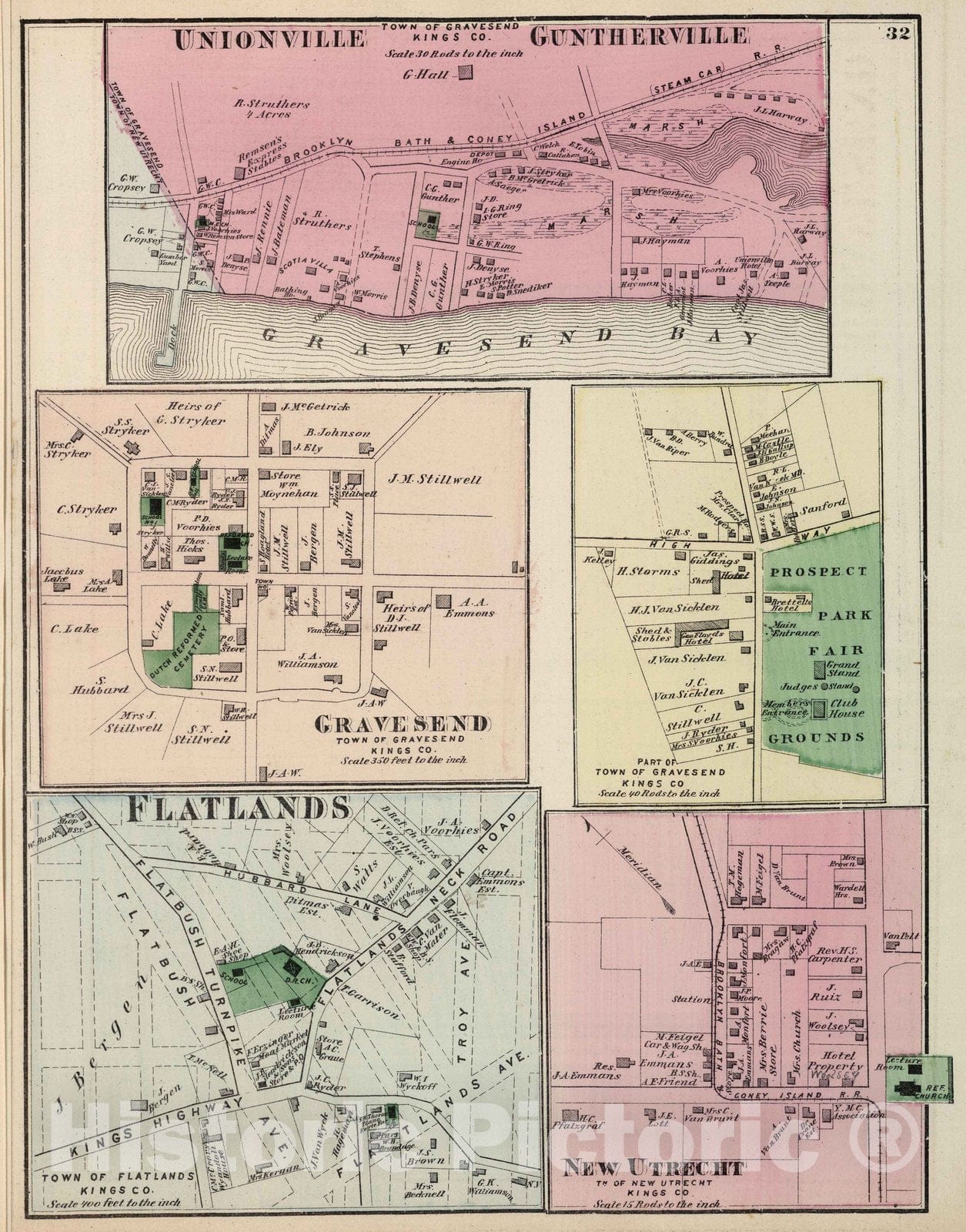 • .Historic Map : 1873 Unionville, Guntherville, in Gravesend. Flatlands. New Utrecht. Long Island. - Vintage Wall Art