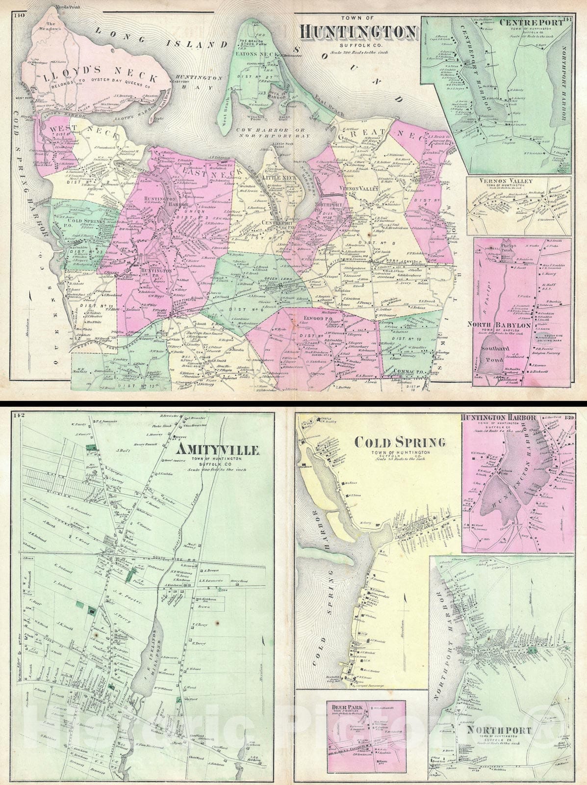 Historic Map : Huntington and Amityville, Long Island, New York, Beers, 1873, Vintage Wall Art