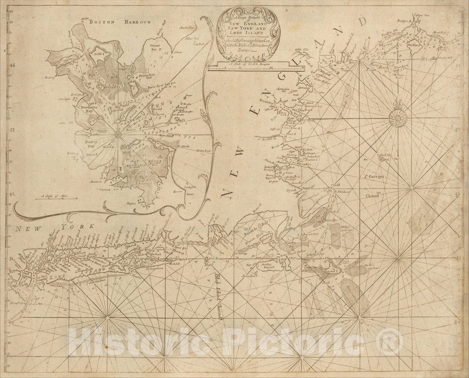 • .Historic Map : A Large Draught of New England New York and Long Island -- Sold By George Grierson at the two Bibles in Esses Street Dublin, 1749, Vintage Wall Art