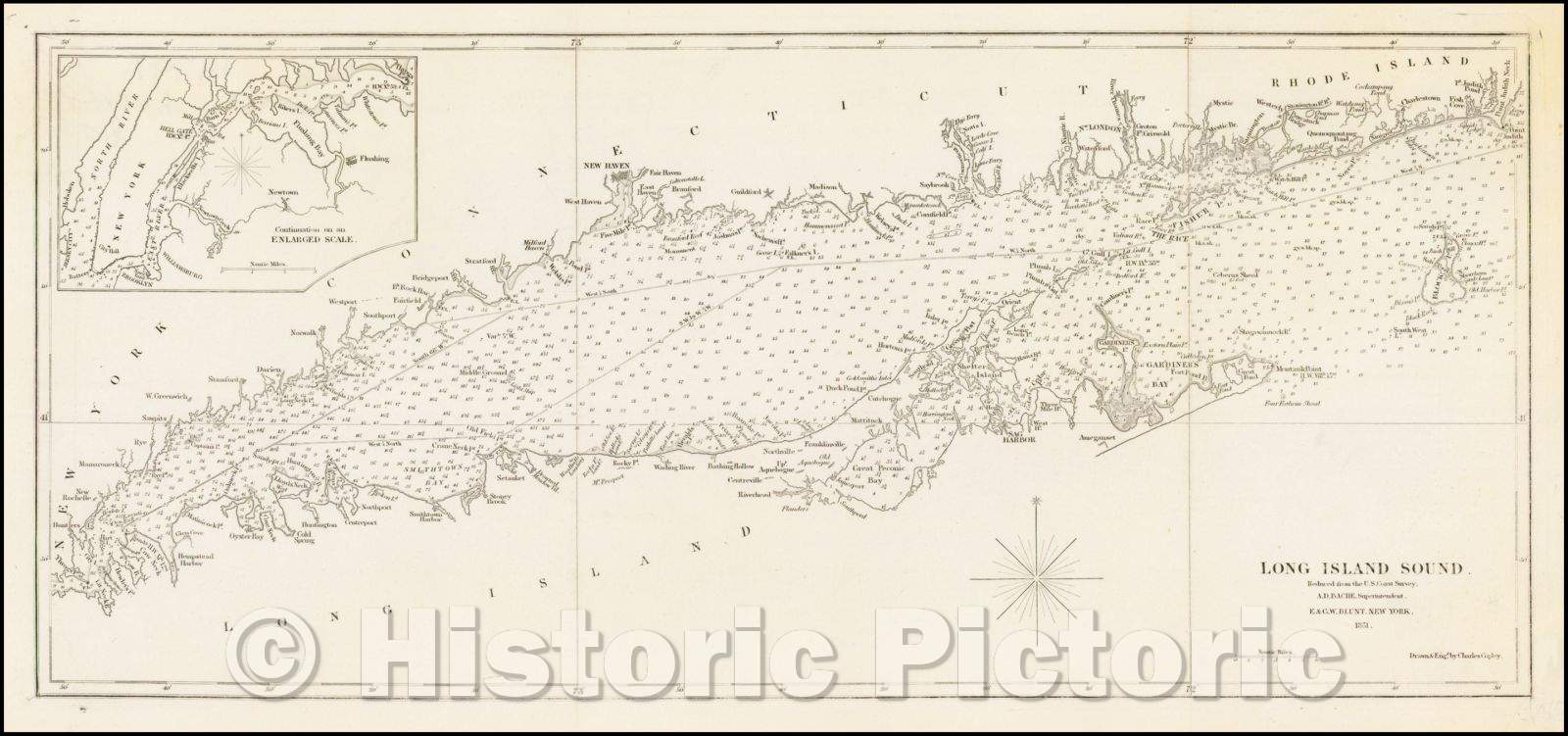 Historic Map - Long Island Sound. Reduced from the U.S. Coast Survey. A.D. Bache, Superintendent, 1851, Charles Copley - Vintage Wall Art