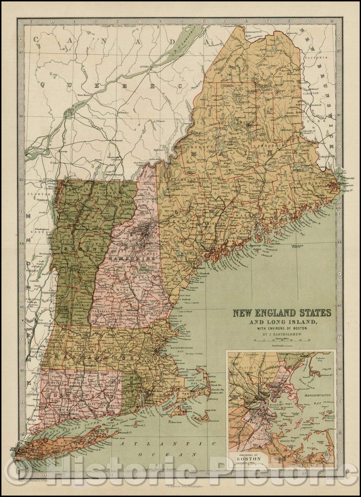 Historic Map - New England and Long Island, with Environs of Boston, 1875, T. Ellwood Zell - Vintage Wall Art