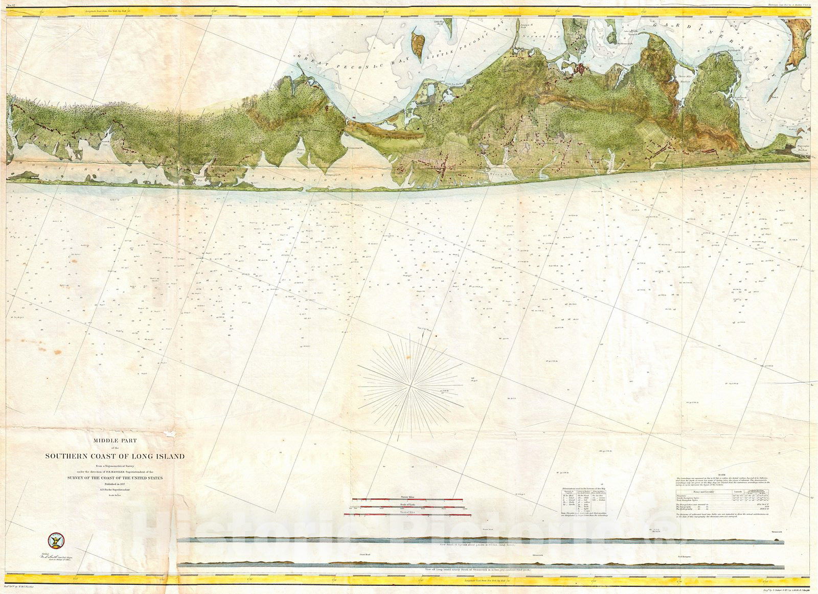 This is an extraordinary and extremely rare hand colored large format 1857 U.S. Coast Survey sea chart or map depicting southeastern Long Island, New York. Details part of Suffolk County from Moriches Bay to Napeague Harbor, including the summer getaways of Sag Harbor, East Hampton, Southampton (South Hampton), Quogue, Bridgehampton and Amagansett, among others. Extends as far north as Gardiner's Island and Hog Neck. Inland regions are depicted in considerable detail, down to individual buildings. In addition to inland details, this chart contains a wealth of practical information for the mariner from oceanic depths, to harbors and navigation tips on important channels. Two views decorate the bottom of the map, one depicting about 9 miles of coast south of Speonk, and another depicting the coast south of Shinnecock. The hand color work on this beautiful map is exceptionally well done. This map was created under the direction of A. D. Bache, Superintendent of the Survey of the Coast of the United States and one of the most influential American cartographers of the 19th century. This is one of the rarest coast chart's out there and one of the best maps of Long Island to appear in the 19th century.