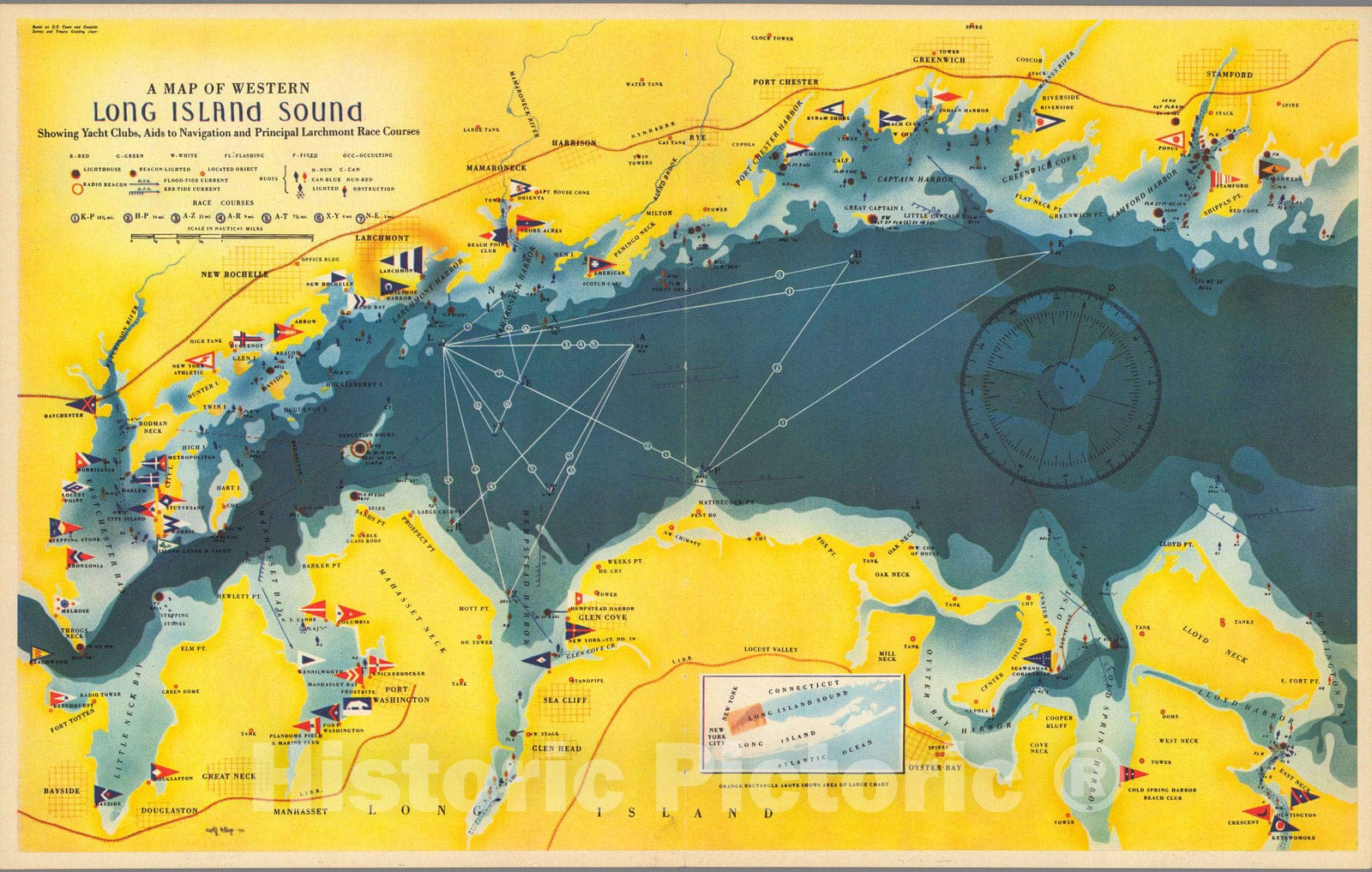 Historic Map : Map of Western Long Island Sound Showing Yacht Clubs, Aids to Navigation etc, 1939 - Vintage Wall Art