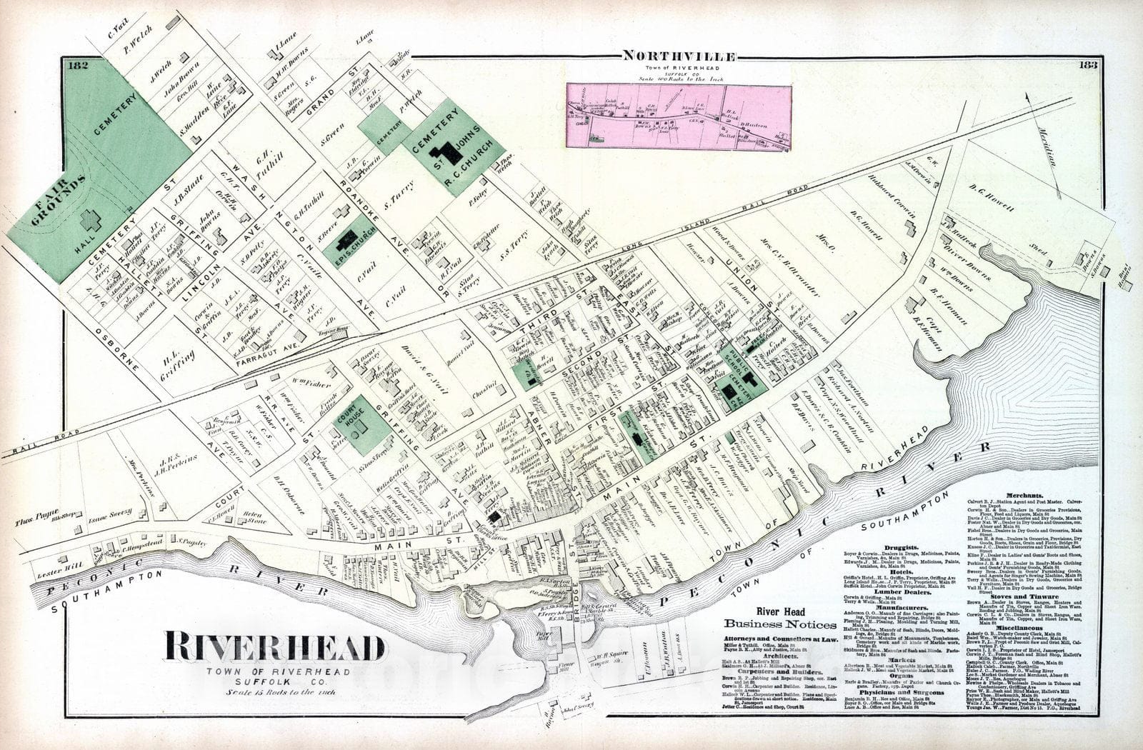 Historic Wall Map : 1873 Riverhead, Northville, in Riverhead. River Head Business Notices. Long Island. - Vintage Wall Art