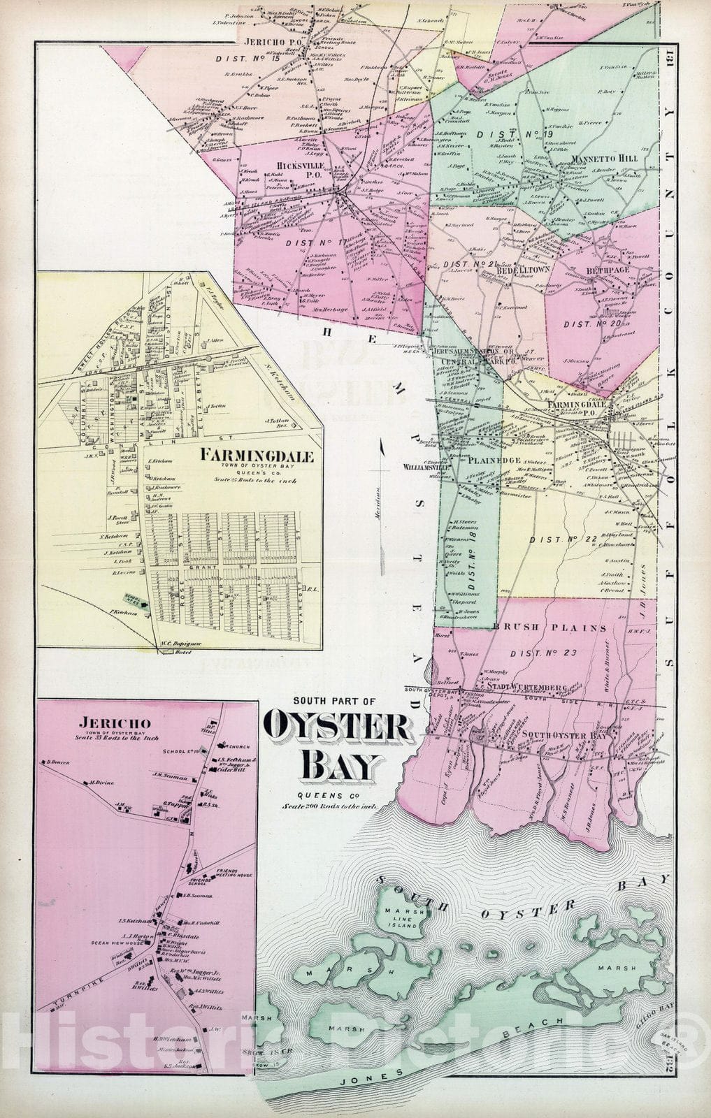 Historic Wall Map : 1873 South Part of Oyster Bay, Farmingdale, Jericho, in Oyster Bay. Long Island.