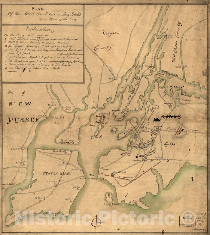Historical Map, 1776 Plan of The Attack The Rebels on Long Island, by an Officer of The Army, Vintage Wall Art