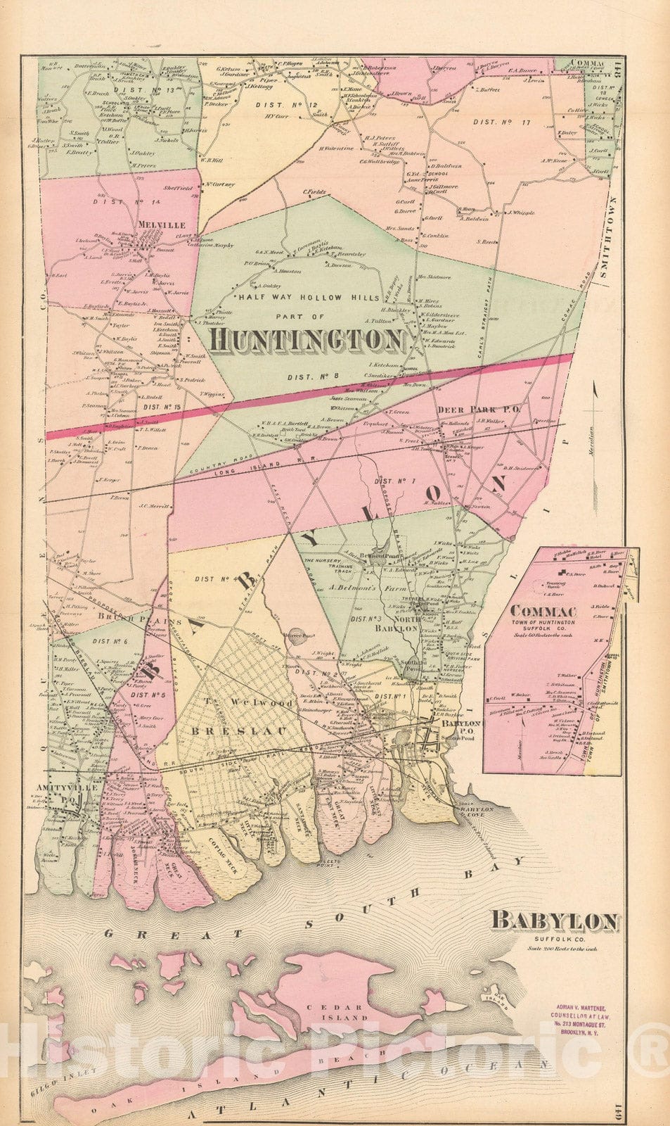 Historic Map : Atlas of Long Island, New York, Babylon & Huntington 1873 , v2, Vintage Wall Art