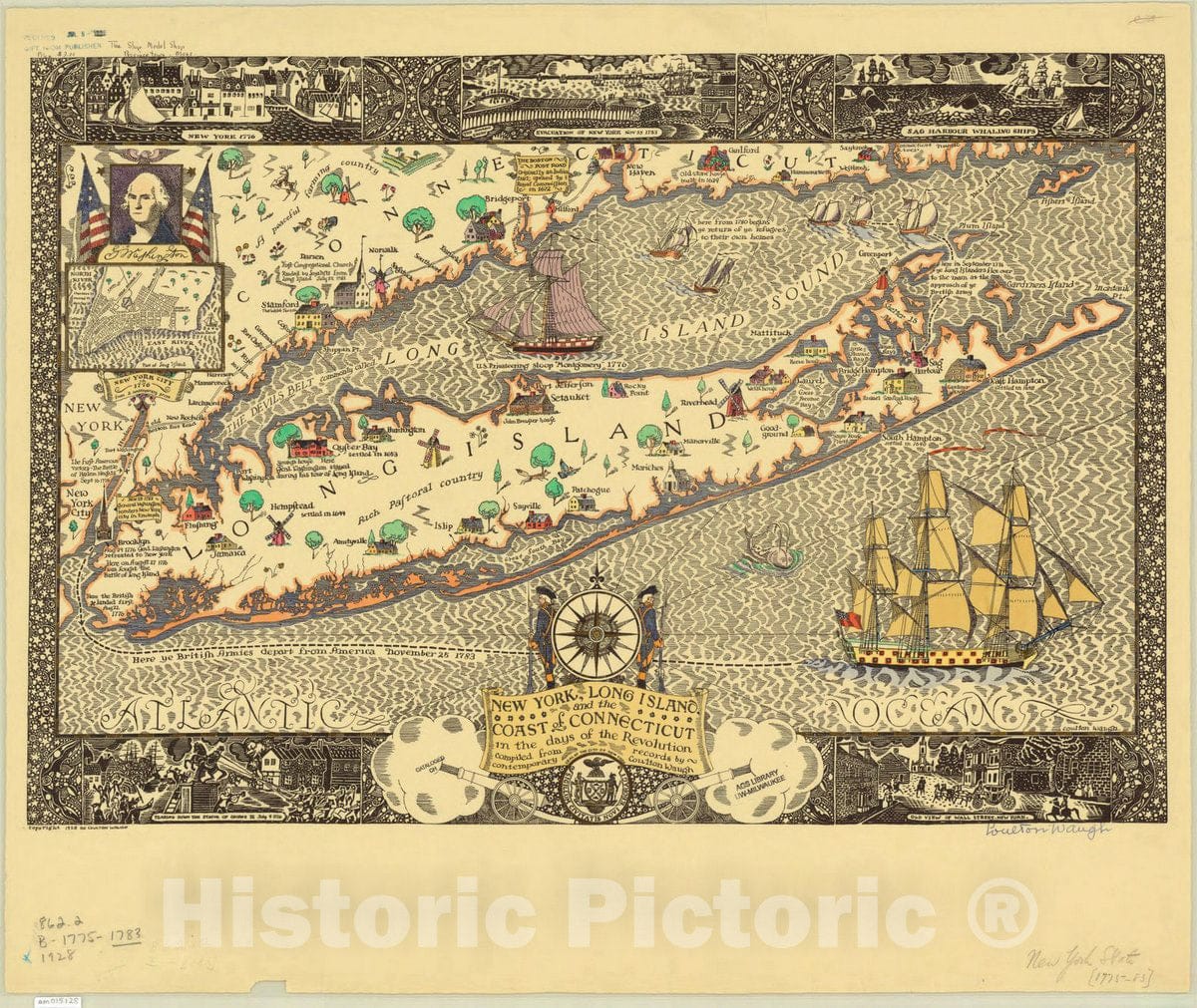 • .Map : Long Island, New York 1928, New York, Long Island and the coast of Connecticut in the days of the Revolution , Antique Vintage Reproduction