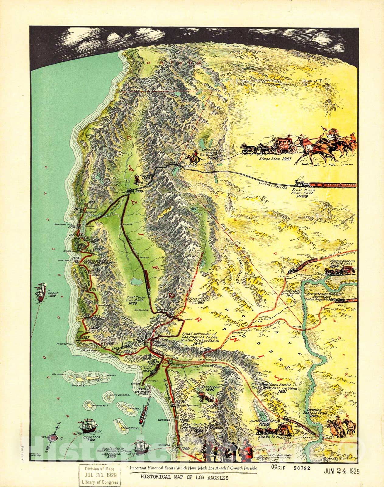 Historic 1929 Map - Important Historical Events which Have Made Los Angeles' Growth Possible