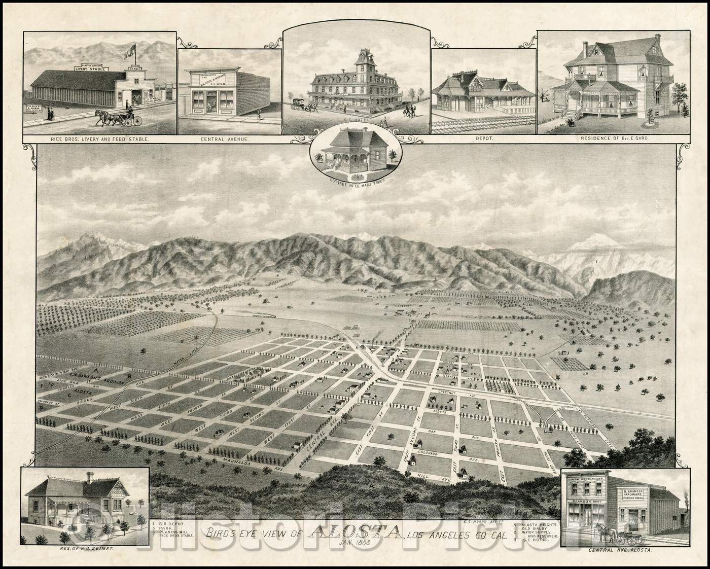 • .Historic Map - Bird's Eye View of Alosta, Los Angeles Co. Cal. Jan, 1888, E.S. Moore - Vintage Wall Art