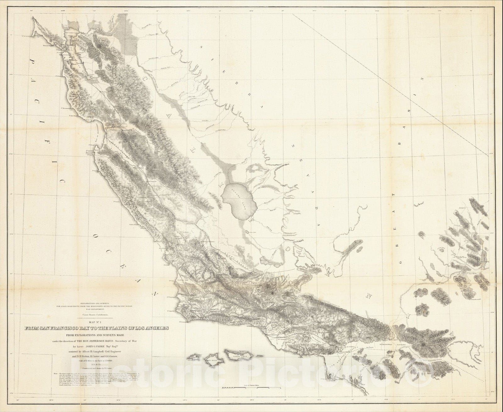 • .Historic Map : Coast Route, California. Map No. 1. From San Francisco Bay to the Plains of Los Angeles , 1855, U.S. Pacific RR Survey, Vintage Wall Art