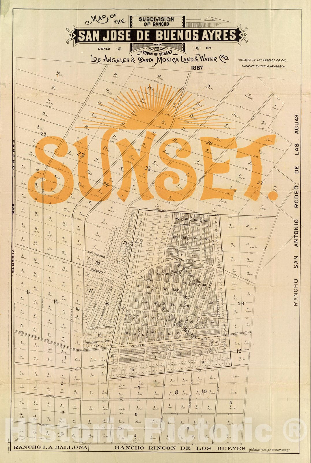 Map of the subdivision of Rancho San Jose de Buenos Ayres and the town of Sunset owned by Los Angeles & Santa Monica Land & Water Co., situated in Los Angeles Co., Cal. Surveyed by Theo. G. Kocher & Co. 1887. Los Angeles Litho. Co., 48 to 52 Banning St. | Map of the subdivision of Rancho San Jose de Buenos Ayres and the town of Sunset owned by Los Angeles & Santa Monica Land & Water Co., situated in Los Angeles Co., Cal. Surveyed by Theo. G. Kocher & Co. 1887. Los Angeles Litho. Co., 48 to 52 Banning St. |
