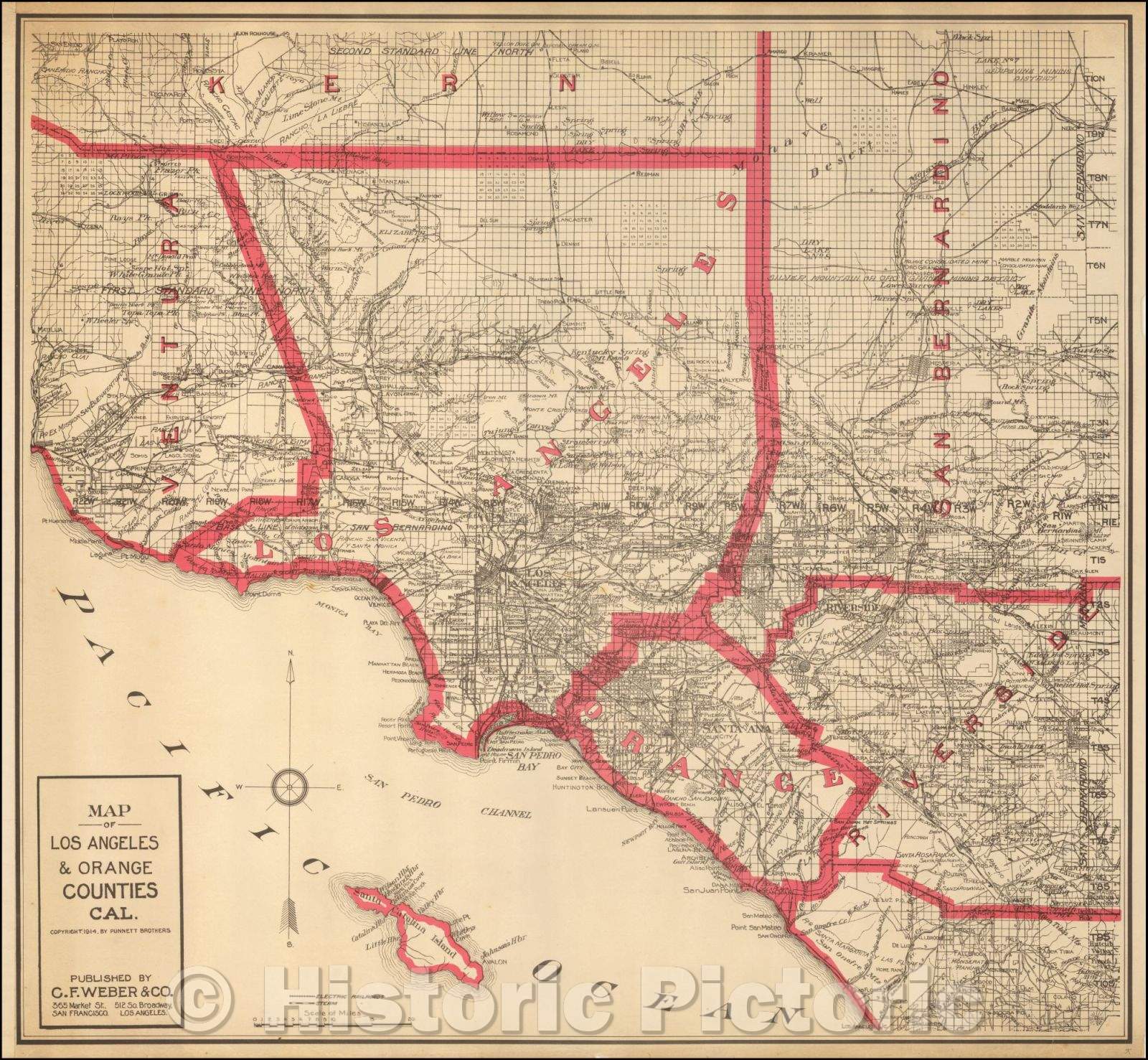 Historic Map - Map of Los Angeles & Orange Counties Cal, 1914, Punnett Brothers - Vintage Wall Art