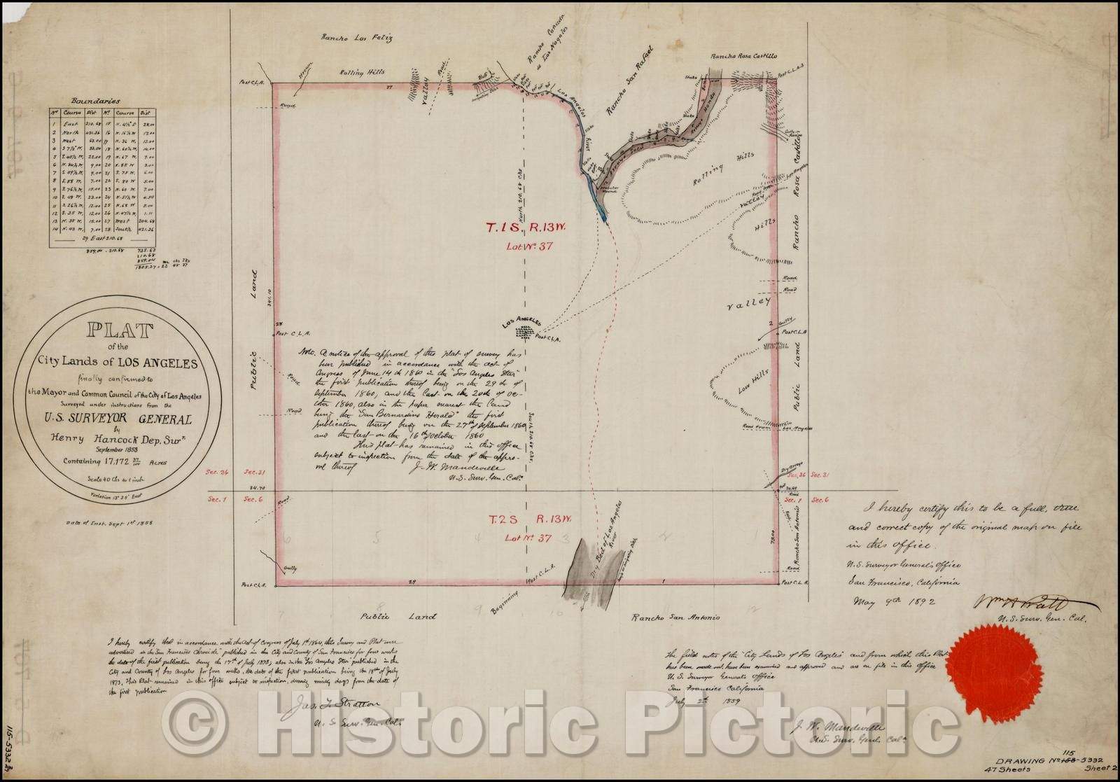Historic Map - Plat of the City Lands Of Los Angeles finally confirmed to the Mayor and Common Council of the City of Los Angeles Surveyed, 1853, Henry Hancock - Vintage Wall Art