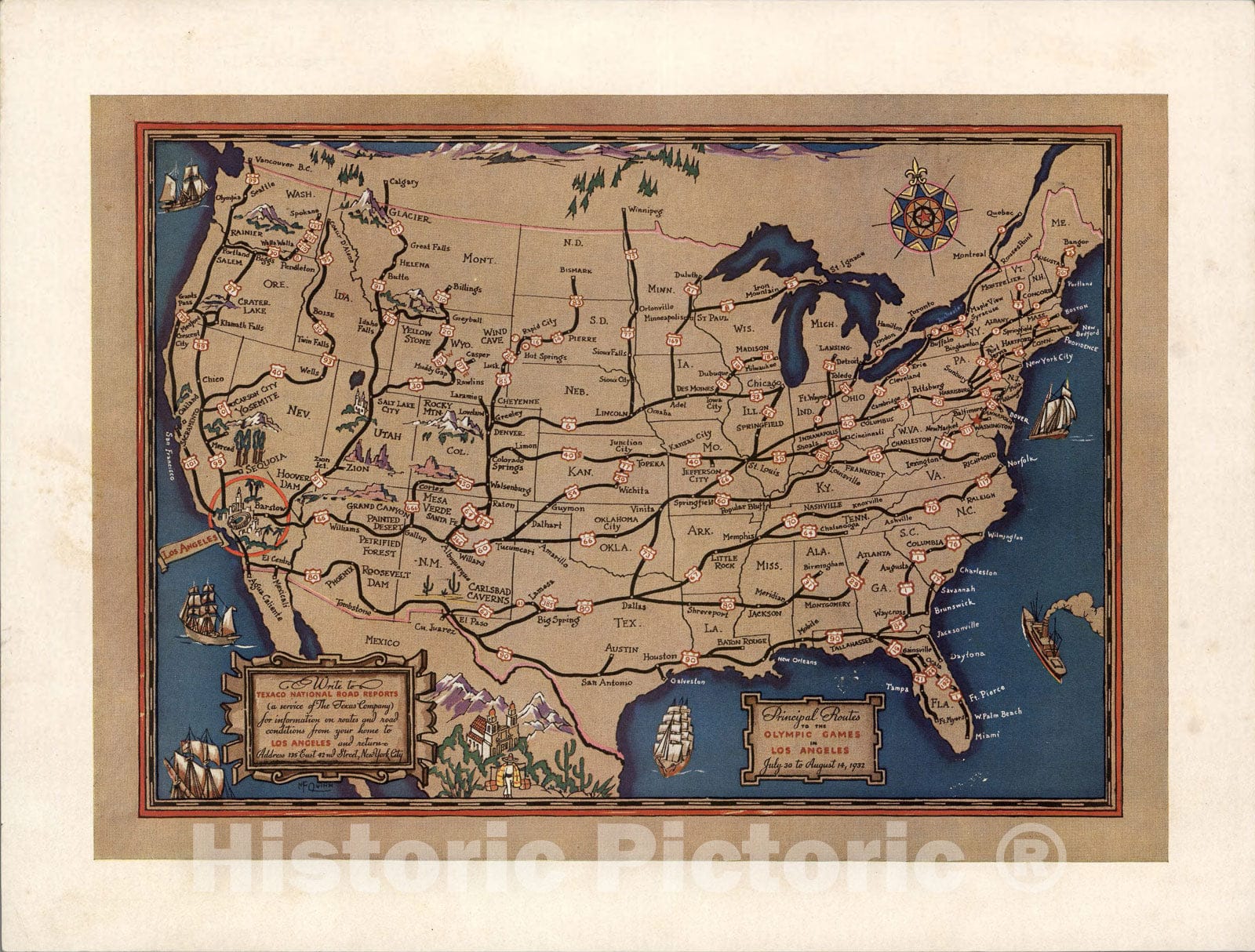 Historic Map : Principal routes to the Olympic games in Los Angeles, July thirty to August 14, 1932, 1932, Vintage Wall Art