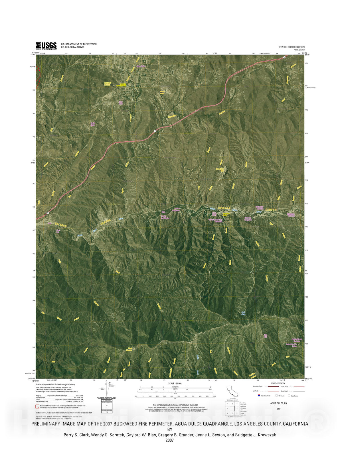 • .Map : Preliminary image map of the 2007 Buckweed Fire perimeter, Agua Dulce quadrangle, Los Angeles County, California, 2008 Cartography Wall Art :