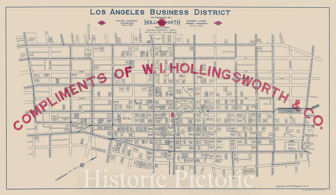 Historic Map - Los Angeles Business District, 1923, W.I. Hollingsworth & Co. - Vintage Wall Art