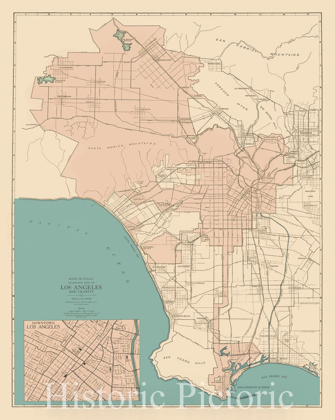 Historic Map - Standard Map of Los Angeles and Vicinity, 1927, Rand McNally & Company - Vintage Wall Art