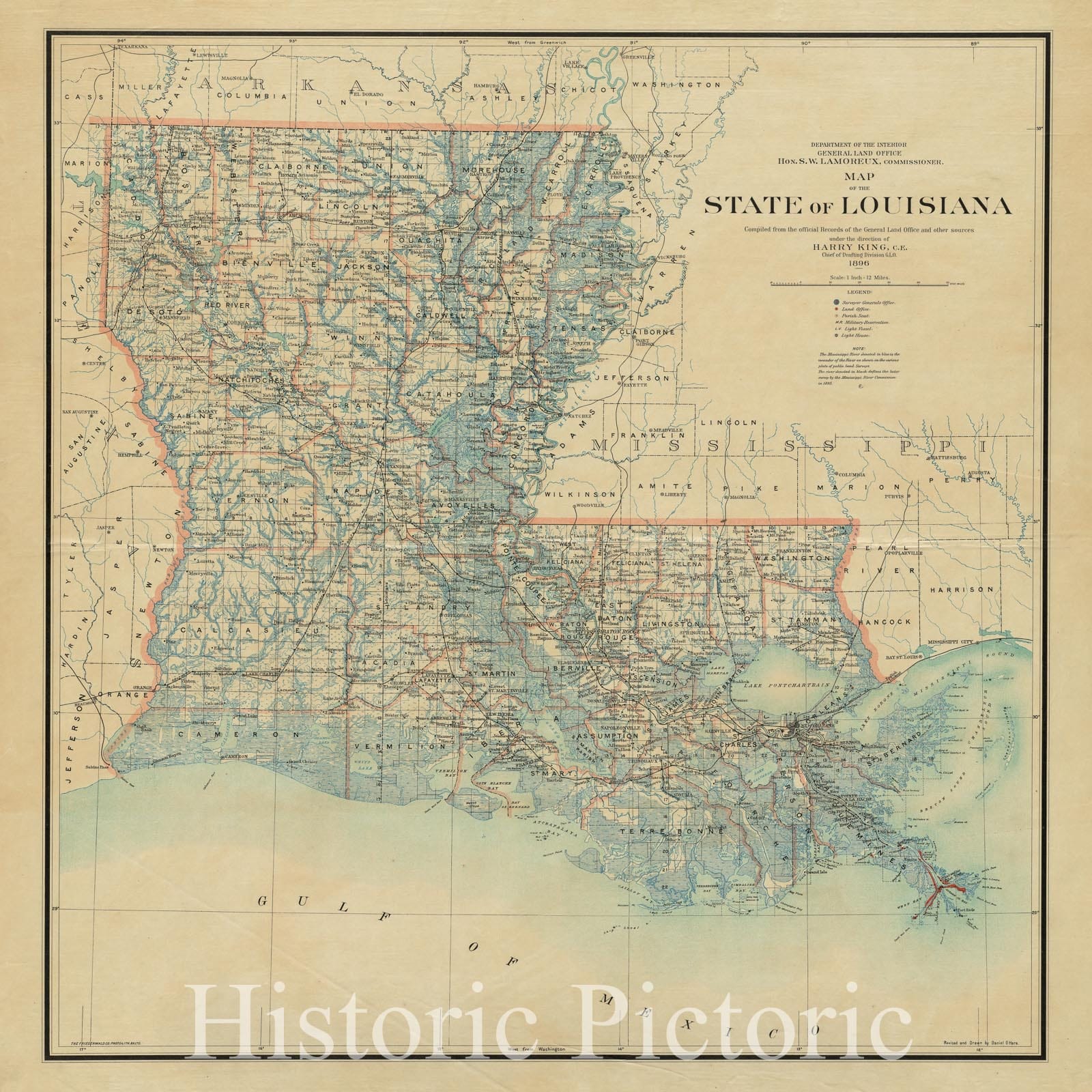 Historical Map, 1887 State of Louisiana, Vintage Wall Art