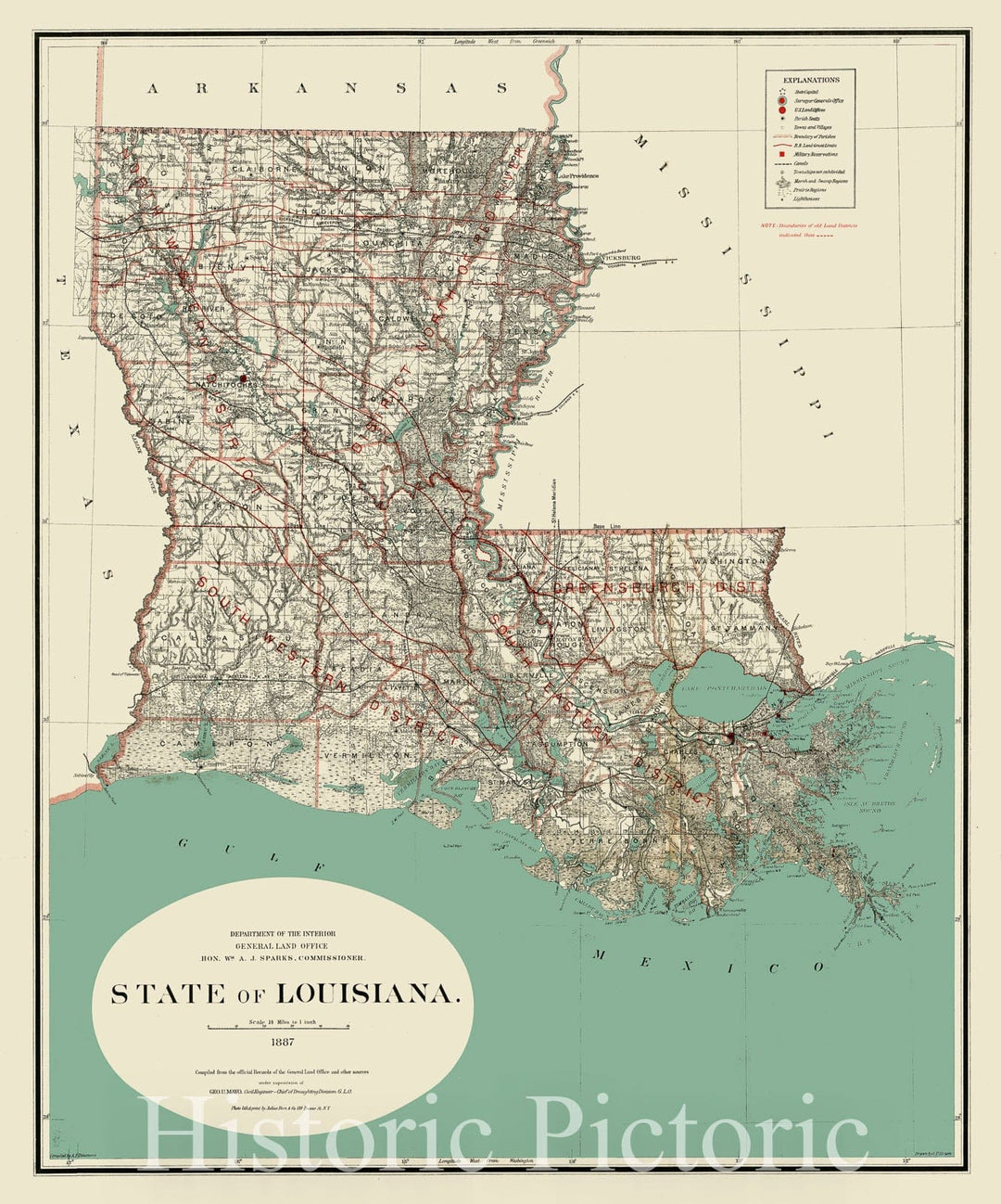 Historic Map - State of Louisiana, 1885, U.S. General Land Office - Vintage Wall Art