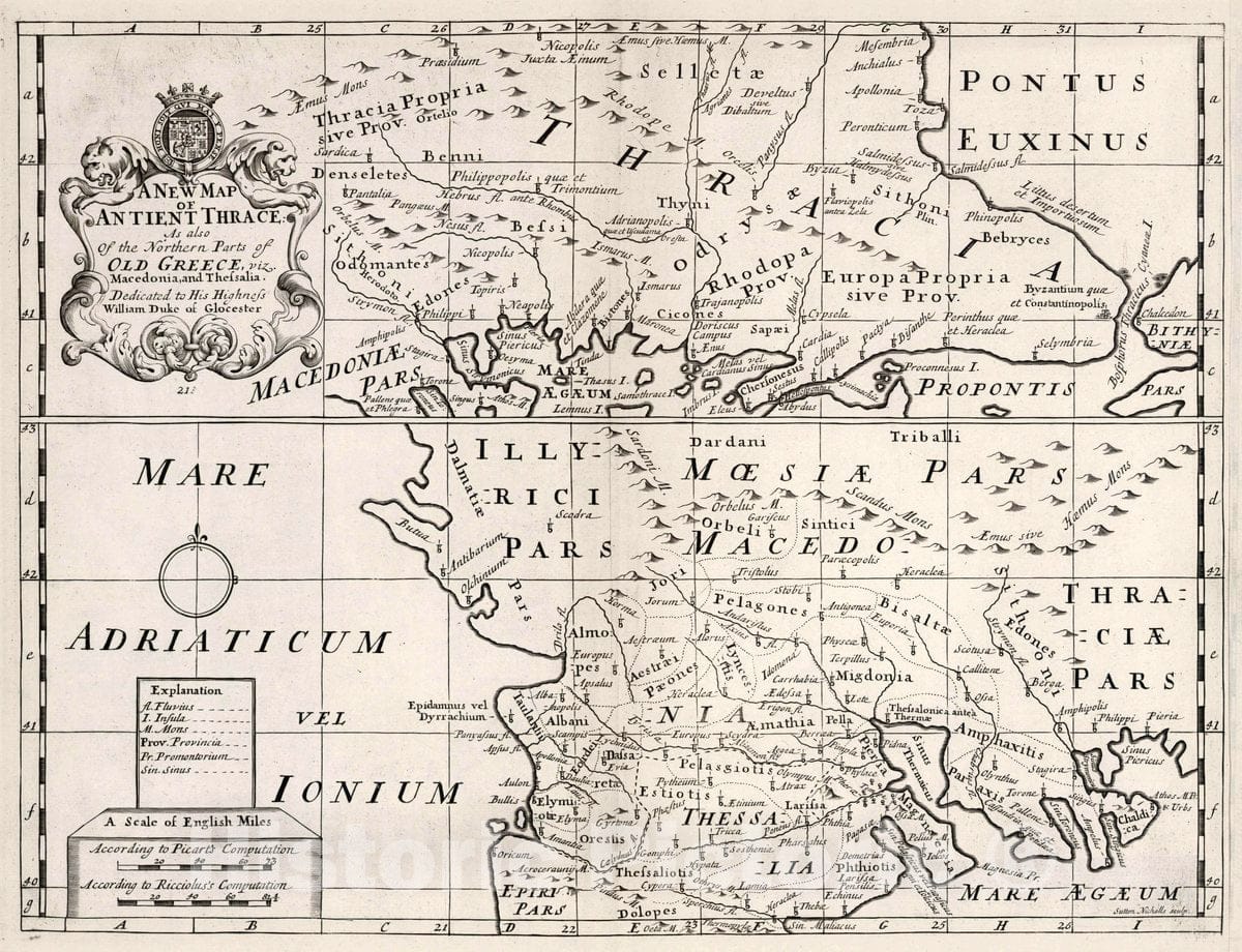 Historic Map : A New map of antient Thrace : as Also of The Northern Parts of Old Greece, viz. Macedonia and Thessalia. Sutton Nicholls sculp, 1700 Atlas - Vintage Wall Art
