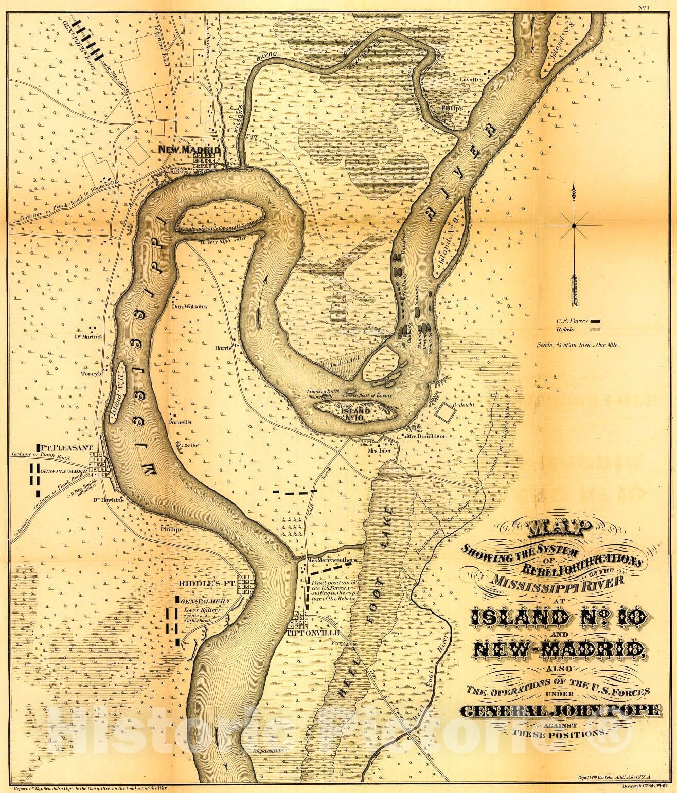 • .Historic 1862 Map - Map Showing The System of Rebel fortifications on The Mississippi River at Island no. 10 and New Madrid, Also The Operations of The U.S. Forces Under General John Pope